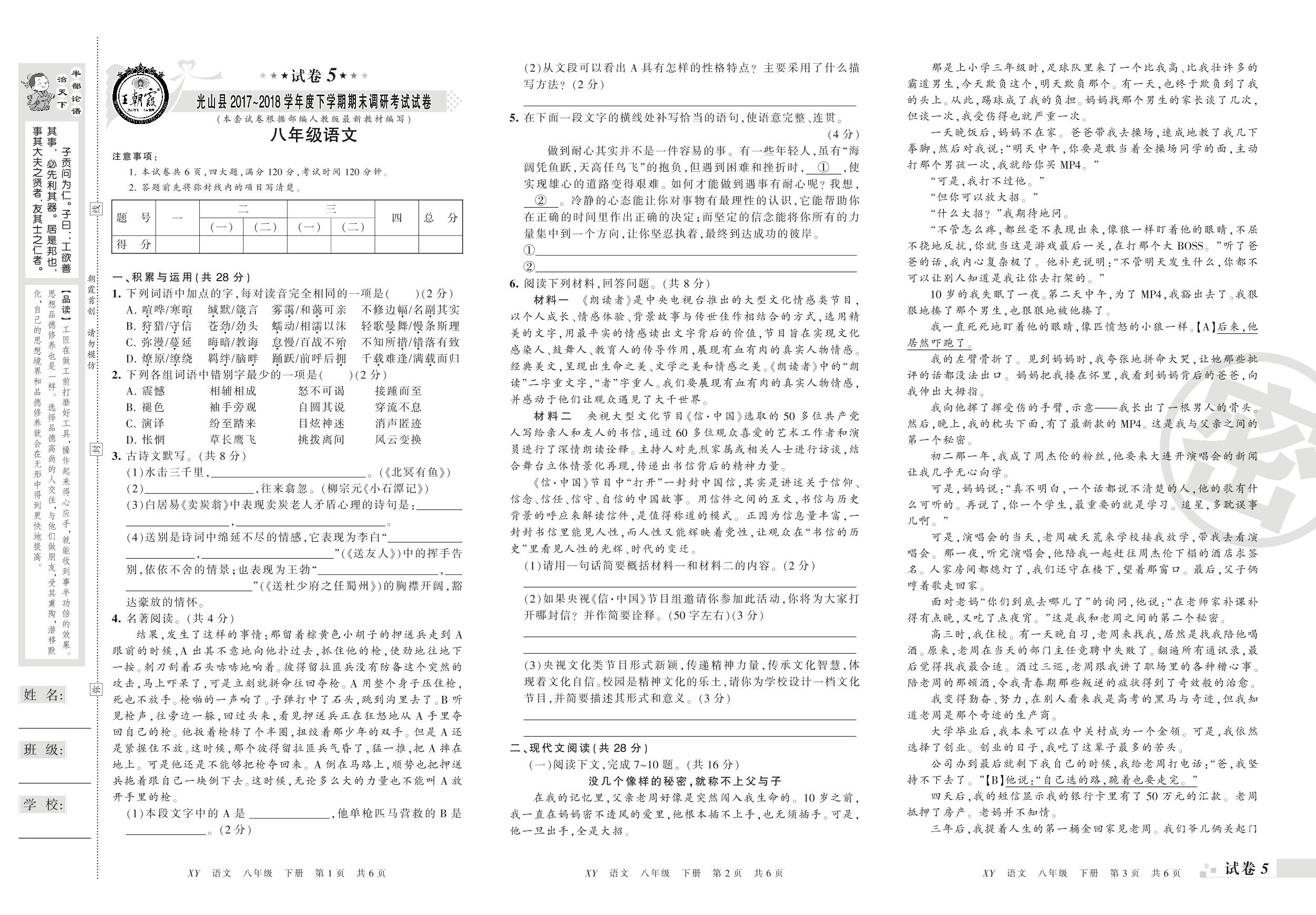 2017-2018学年第二学期信阳市光山县八年级语文试卷(人教版)【5】