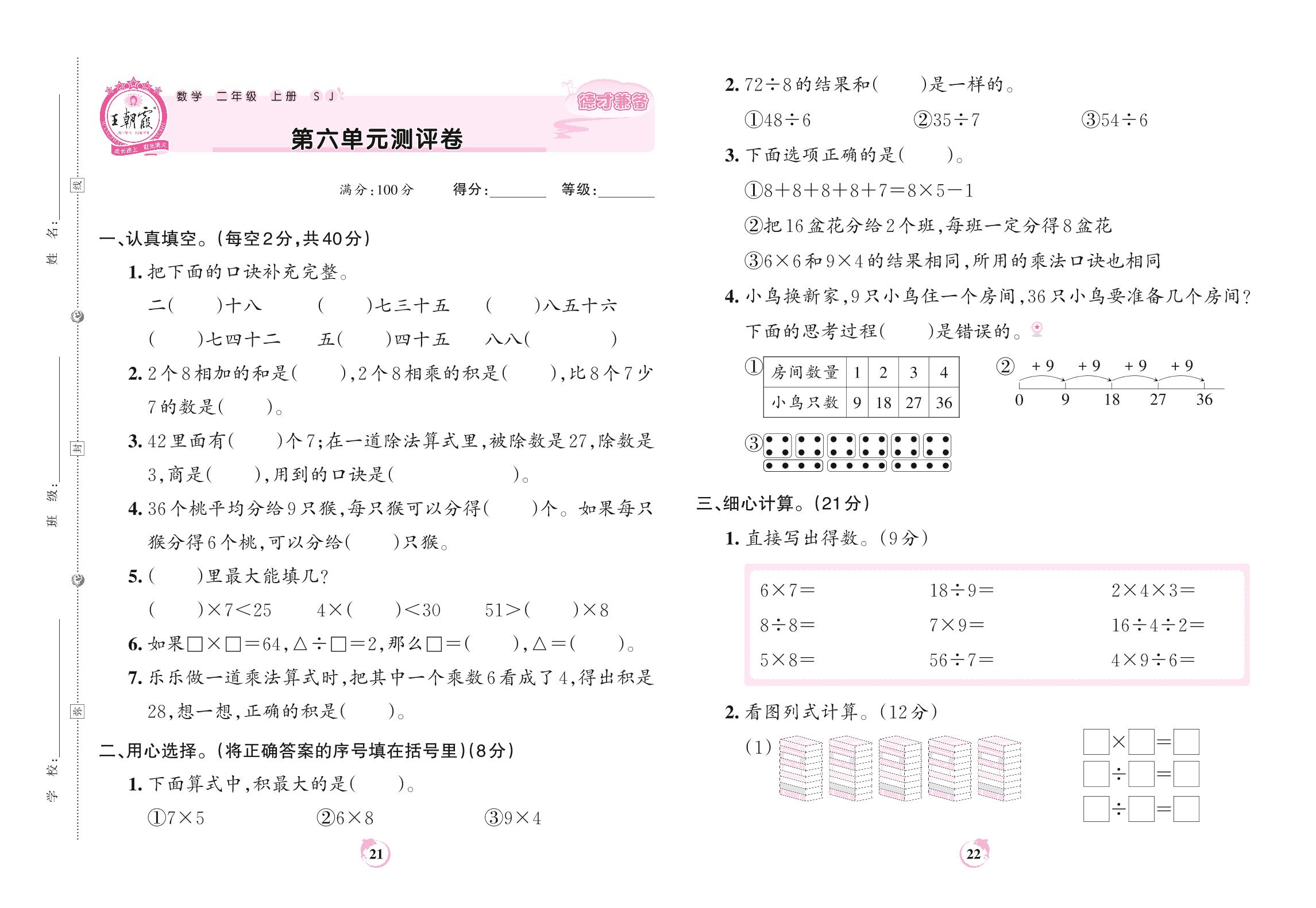 2022上册二年级数学苏教版 第六单元测评卷