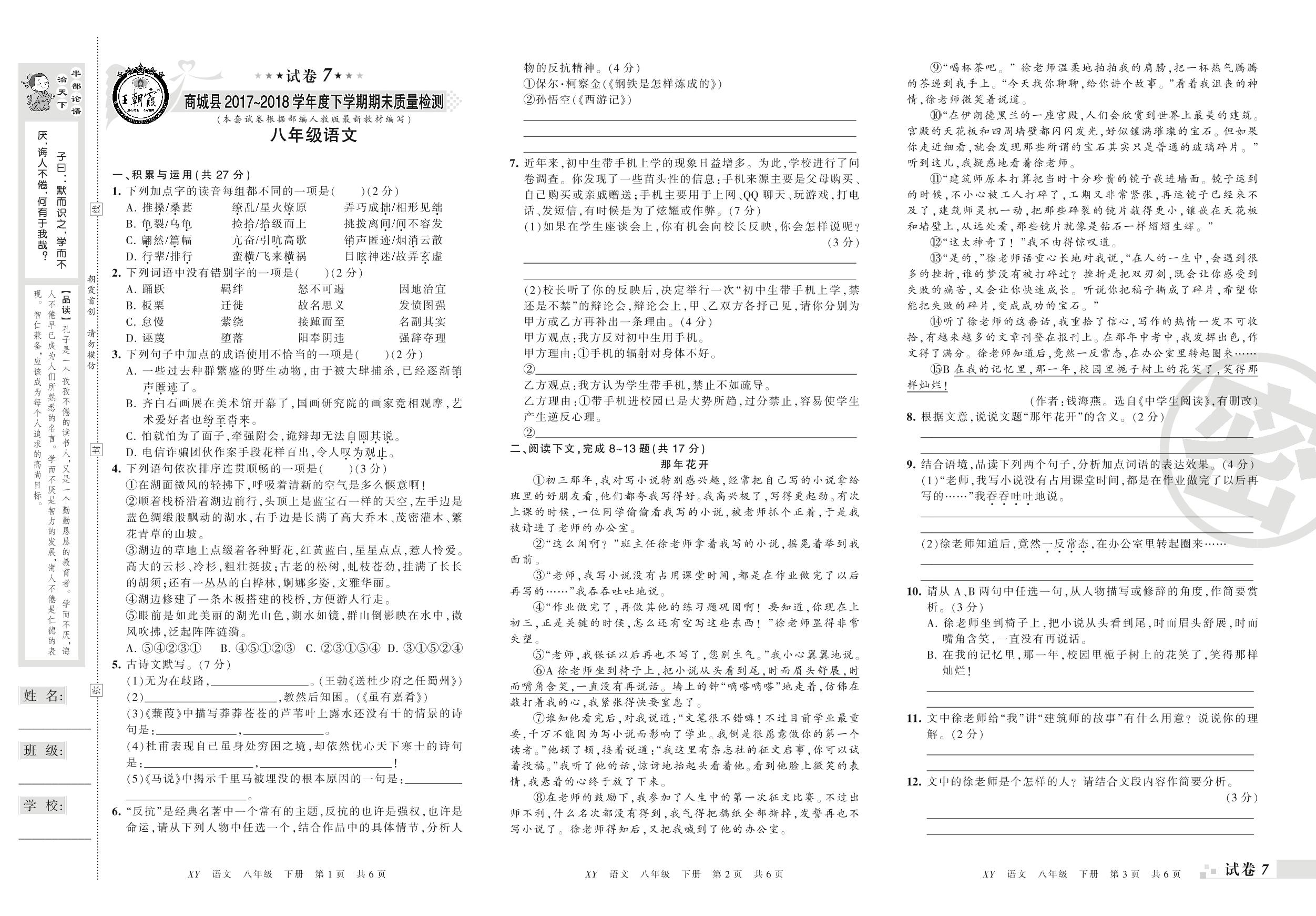 2017-2018学年第二学期信阳市商城县八年级语文试卷(人教版)【7】