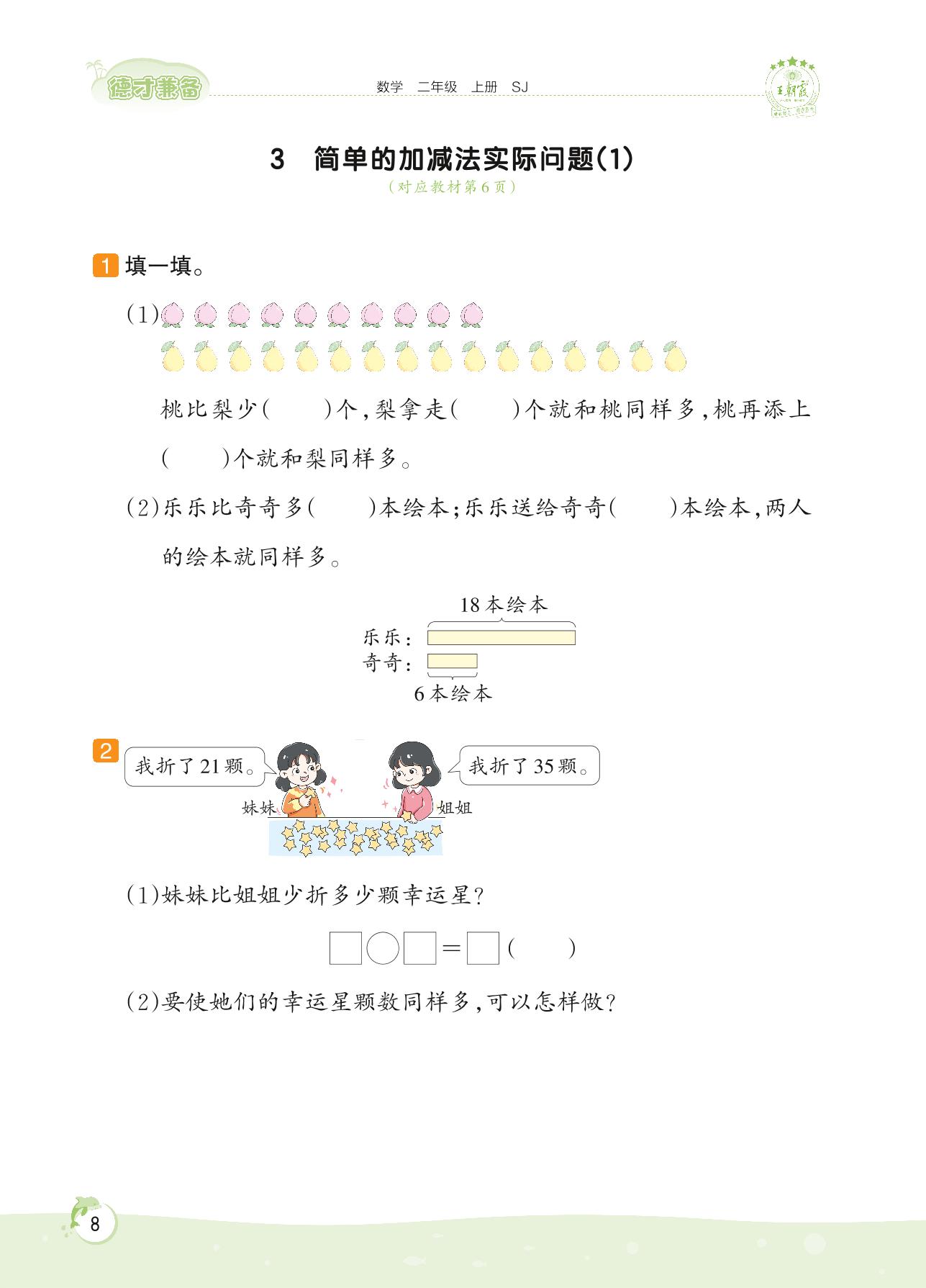 2022上册二年级数学苏教版 第一单元 100以内的加法和减法(三)——3 简单的加减法实际问题(1)