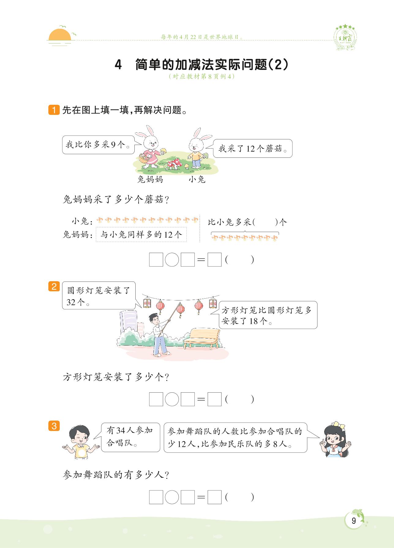 2022上册二年级数学苏教版 第一单元 100以内的加法和减法(三)——4 简单的加减法实际问题(2)