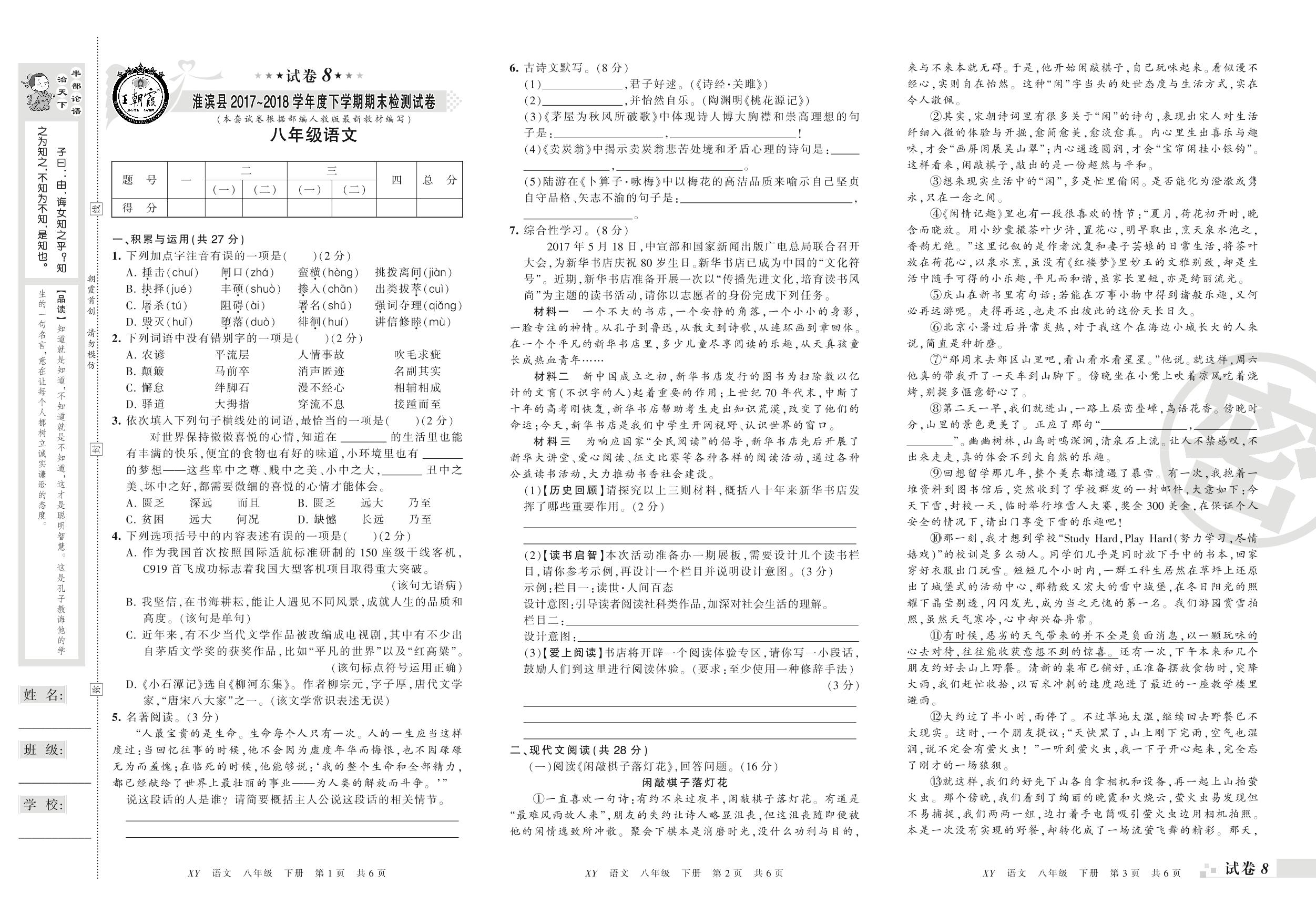 2017-2018学年第二学期信阳市淮滨县八年级语文试卷(人教版)【8】
