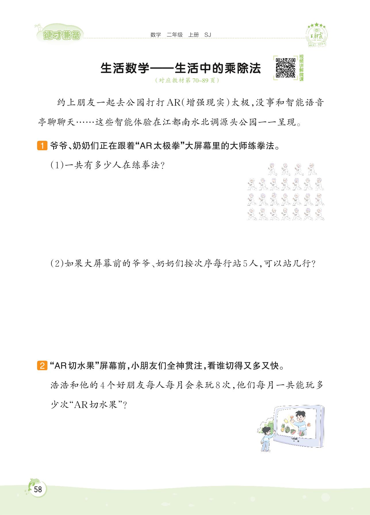2022上册二年级数学苏教版 第六单元 表内乘法和表内除法(二)——生活数学 生活中的乘除法