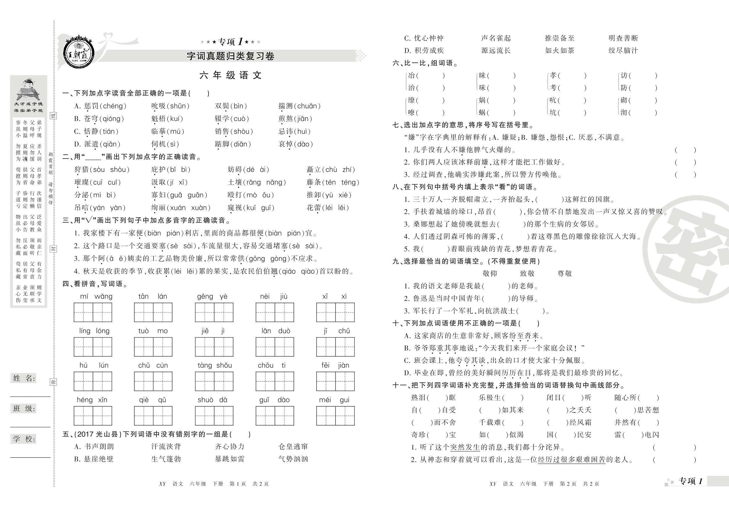 王朝霞期末专项卷——字词、句子真题归类复习卷六年级下册语文(S版)_R21080241111【0】