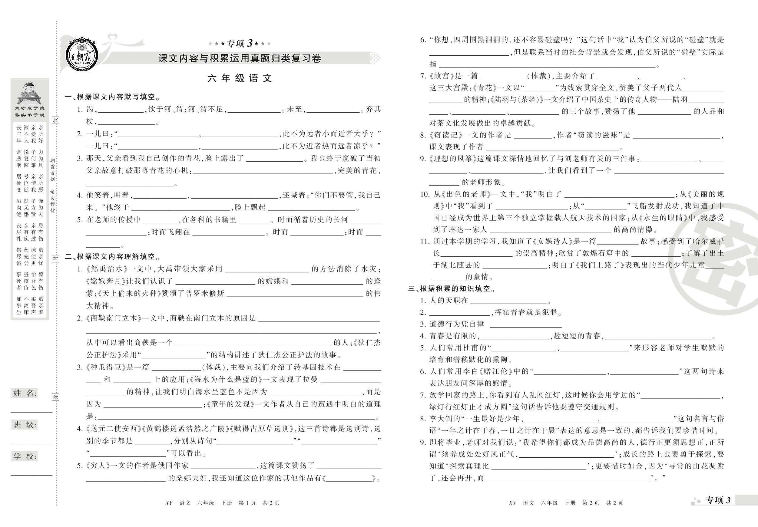 王朝霞期末专项卷——课文内容与积累运用、课内阅读与写作真题归类复习卷六年级下册语文(S版)_R21080241114【0】