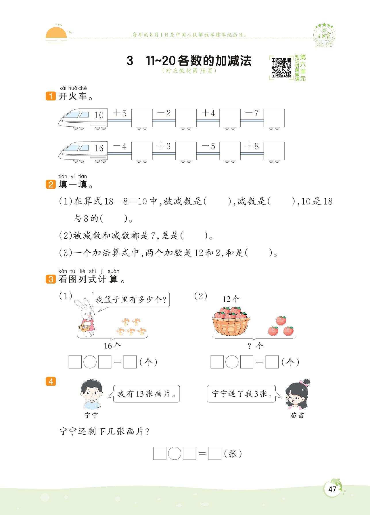 2022上册一年级数学人教版 第六单元 11~20各数的认识——3 11~20各数的加减法