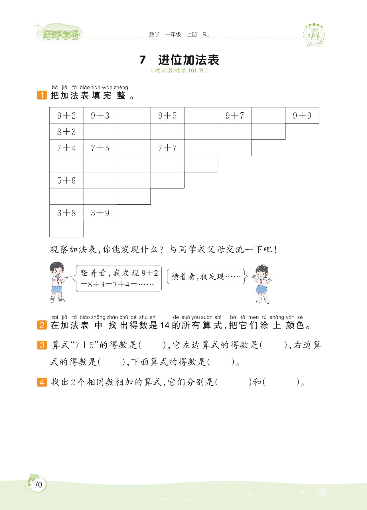 2022上册一年级数学人教版 第八单元 20以内的进位加法——7 进位加法表