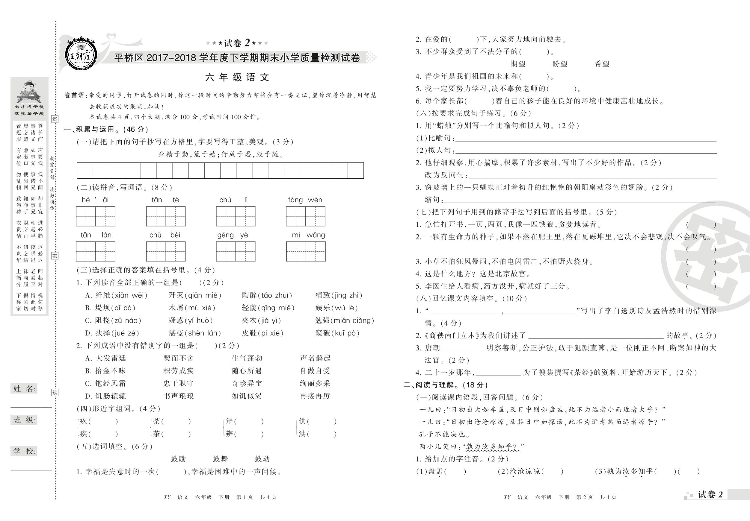 2017-2018学年第二学期信阳市平桥区六年级语文试卷(S版)【2】