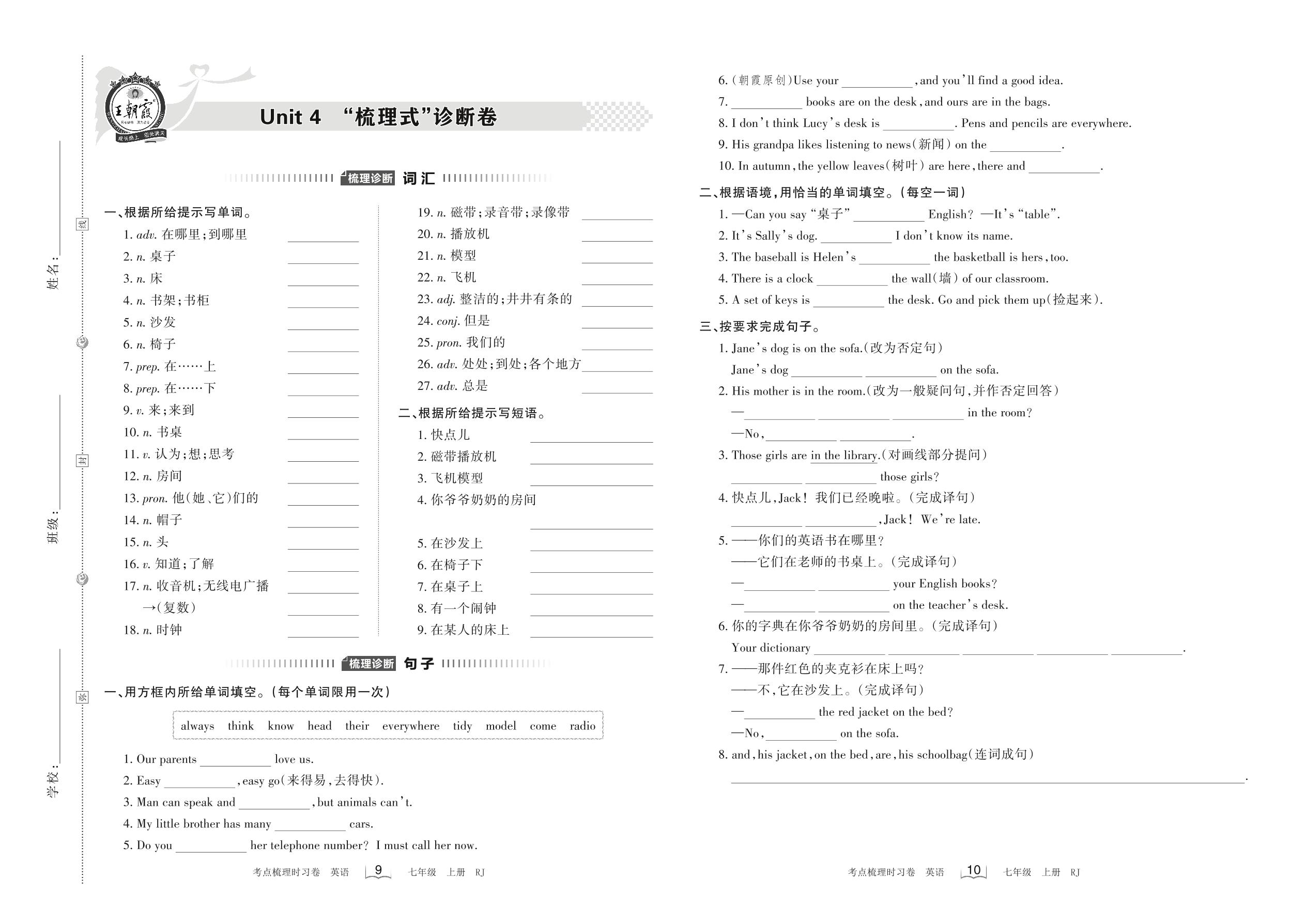 2022上册七年级英语人教版 Unit 4 “梳理式”诊断卷