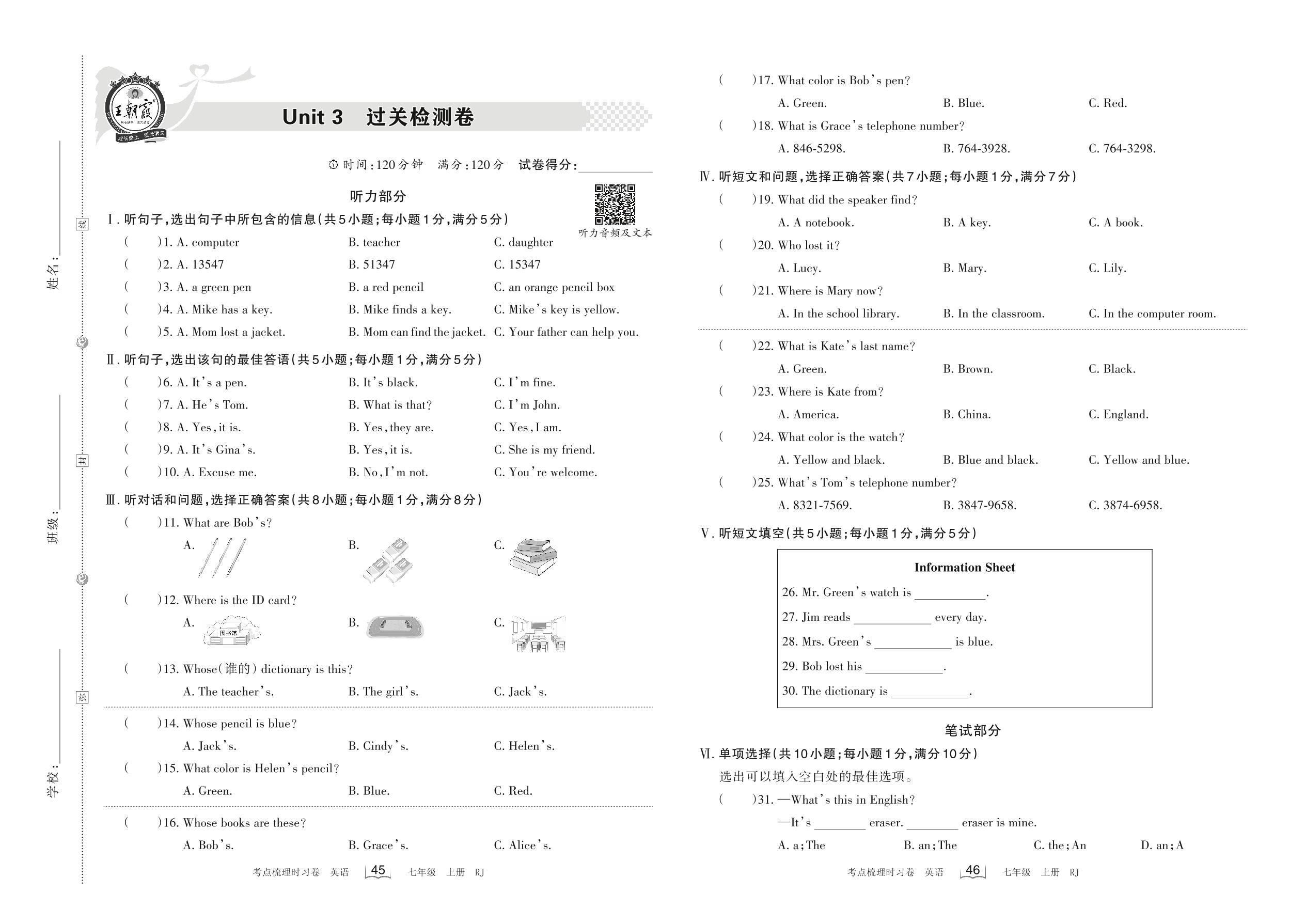 2022上册七年级英语人教版 Unit 3 过关检测卷