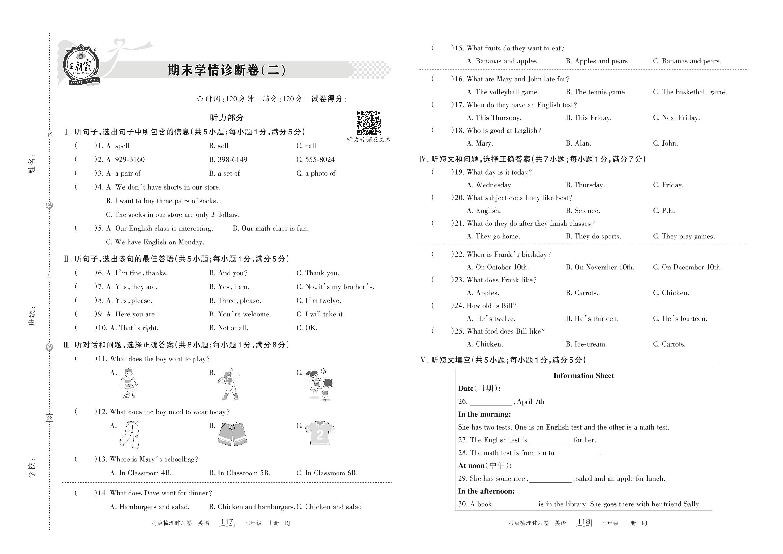 2022上册七年级英语人教版 期末学情诊断卷(二)