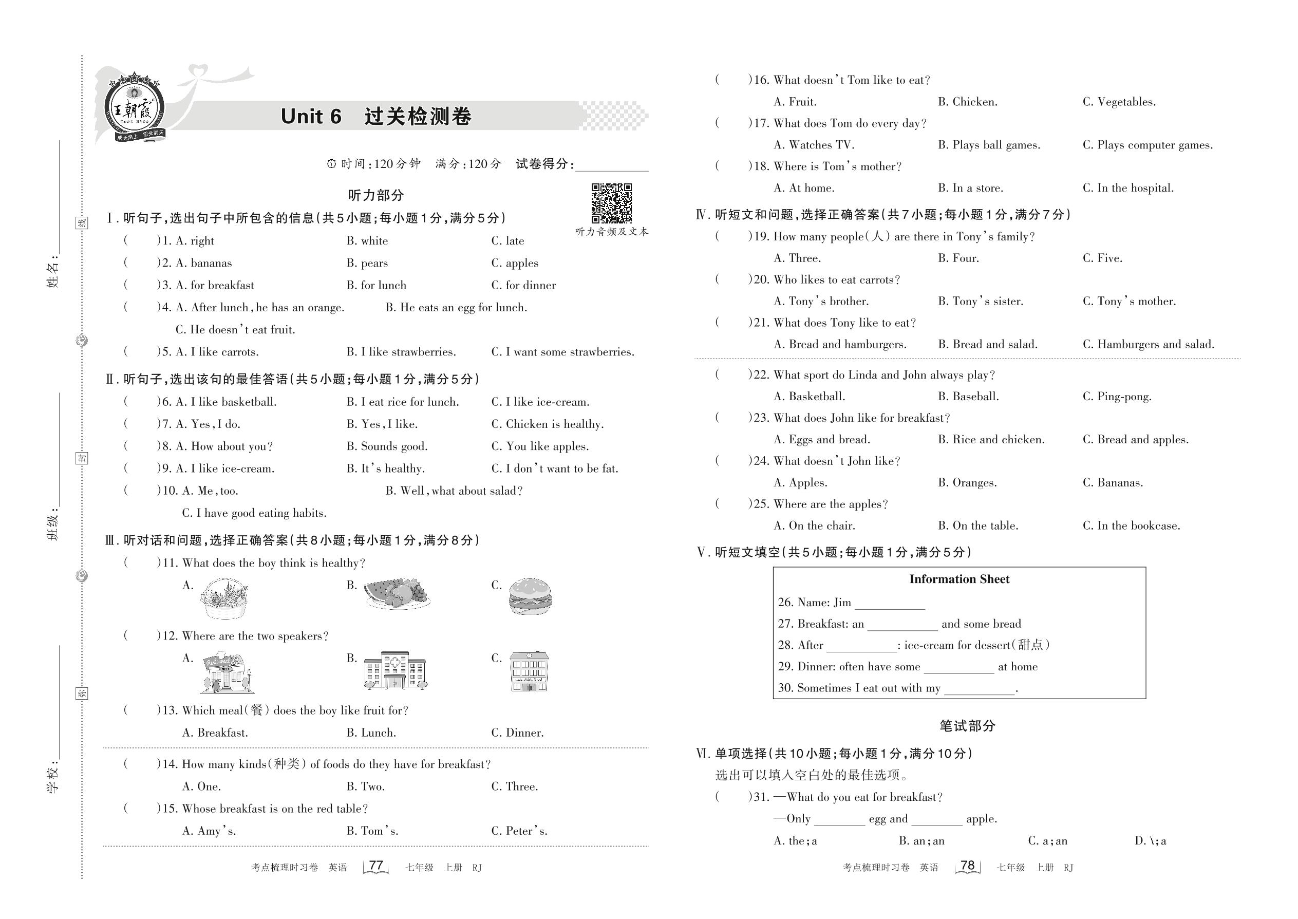 2022上册七年级英语人教版 Unit 6 过关检测卷