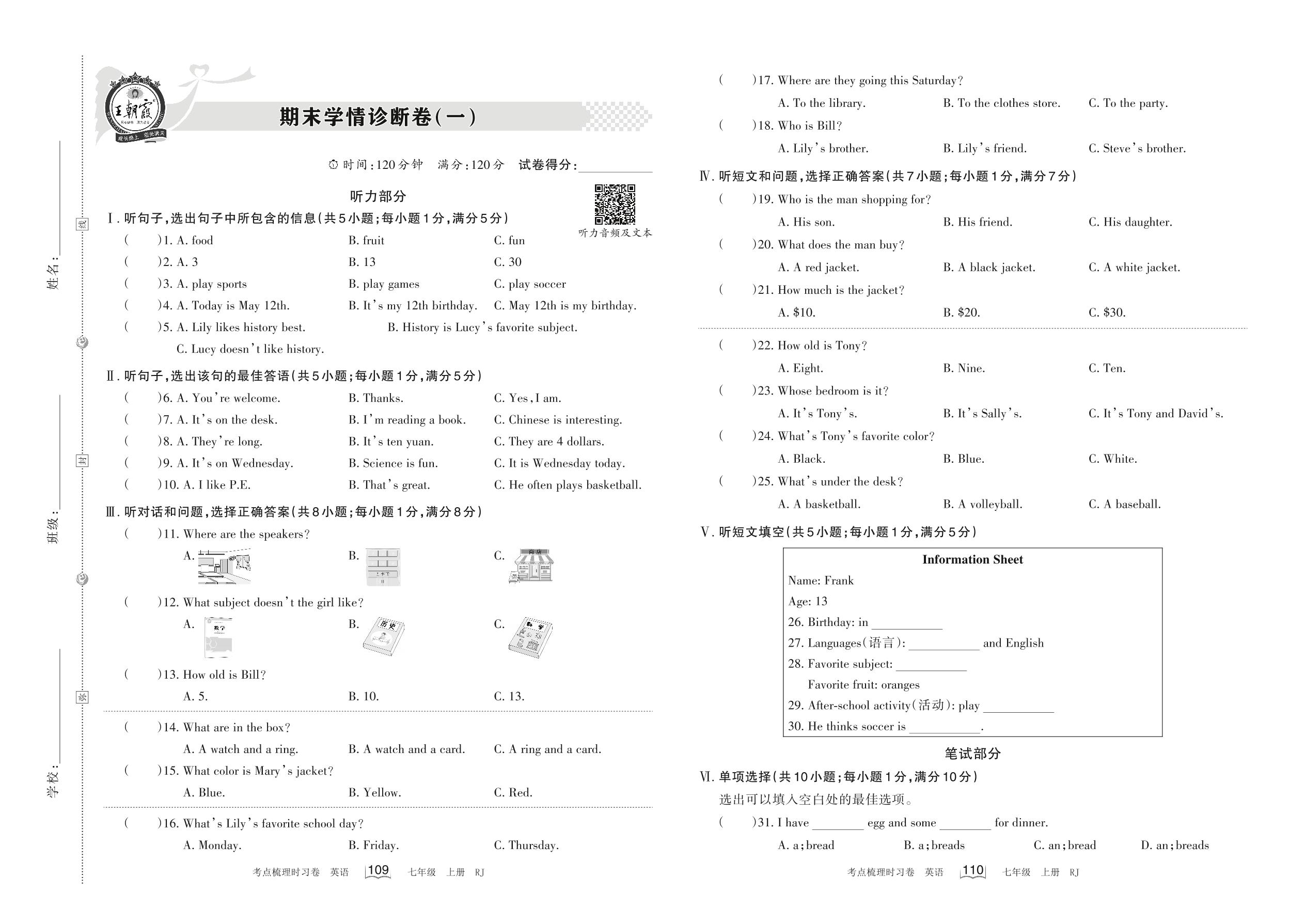 2022上册七年级英语人教版 期末学情诊断卷(一)