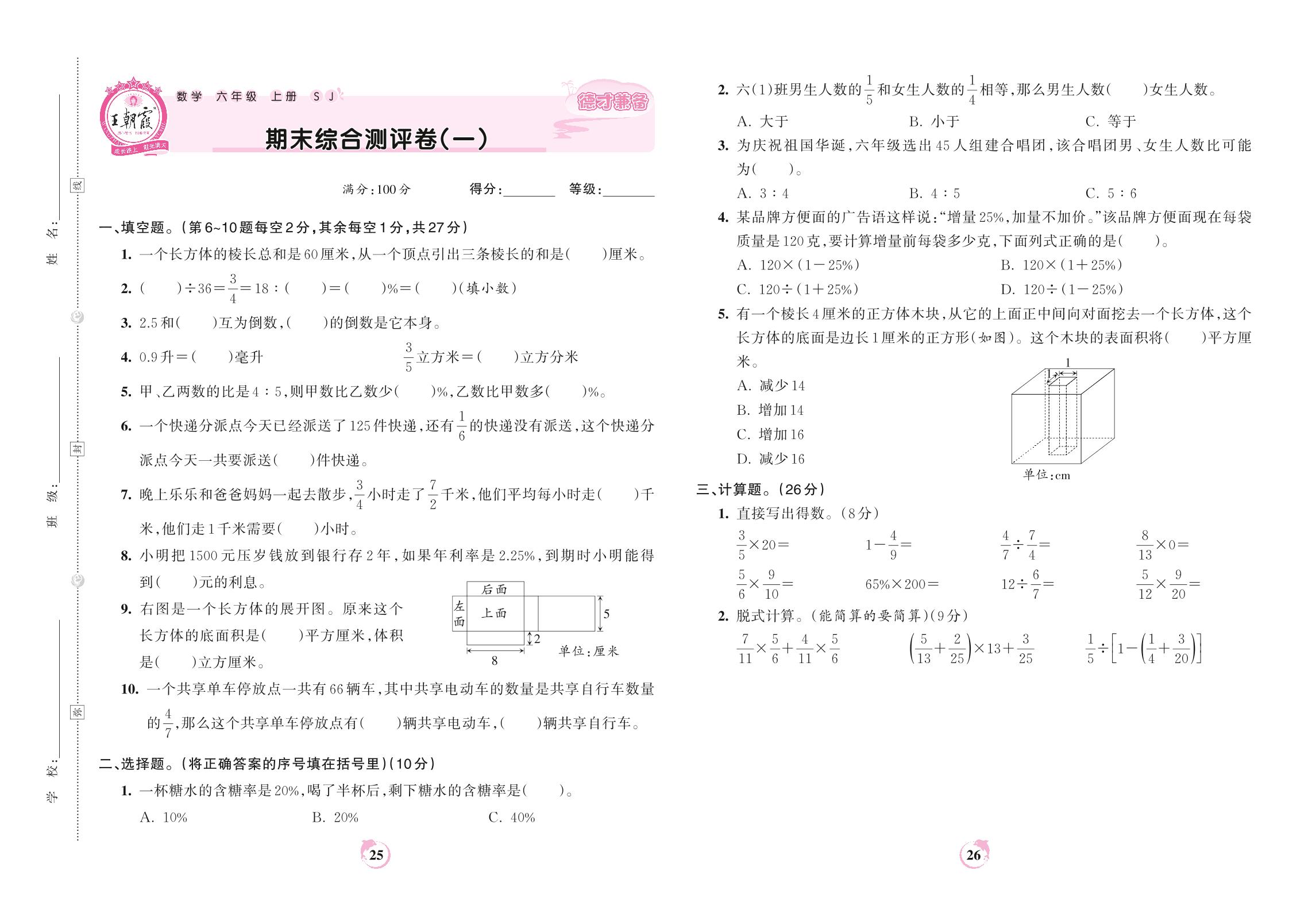 2022上册六年级数学苏教版 期末综合测评卷(一)