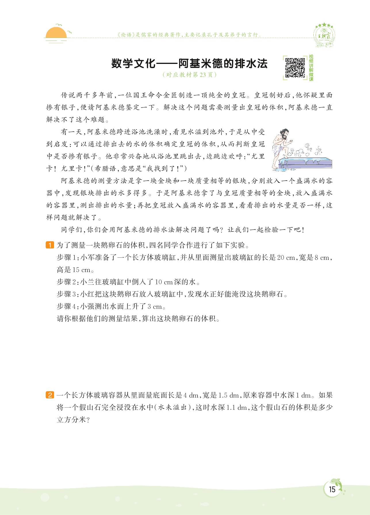 2022上册六年级数学苏教版 第一单元 长方体和正方体——数学文化 阿基米德的排水法
