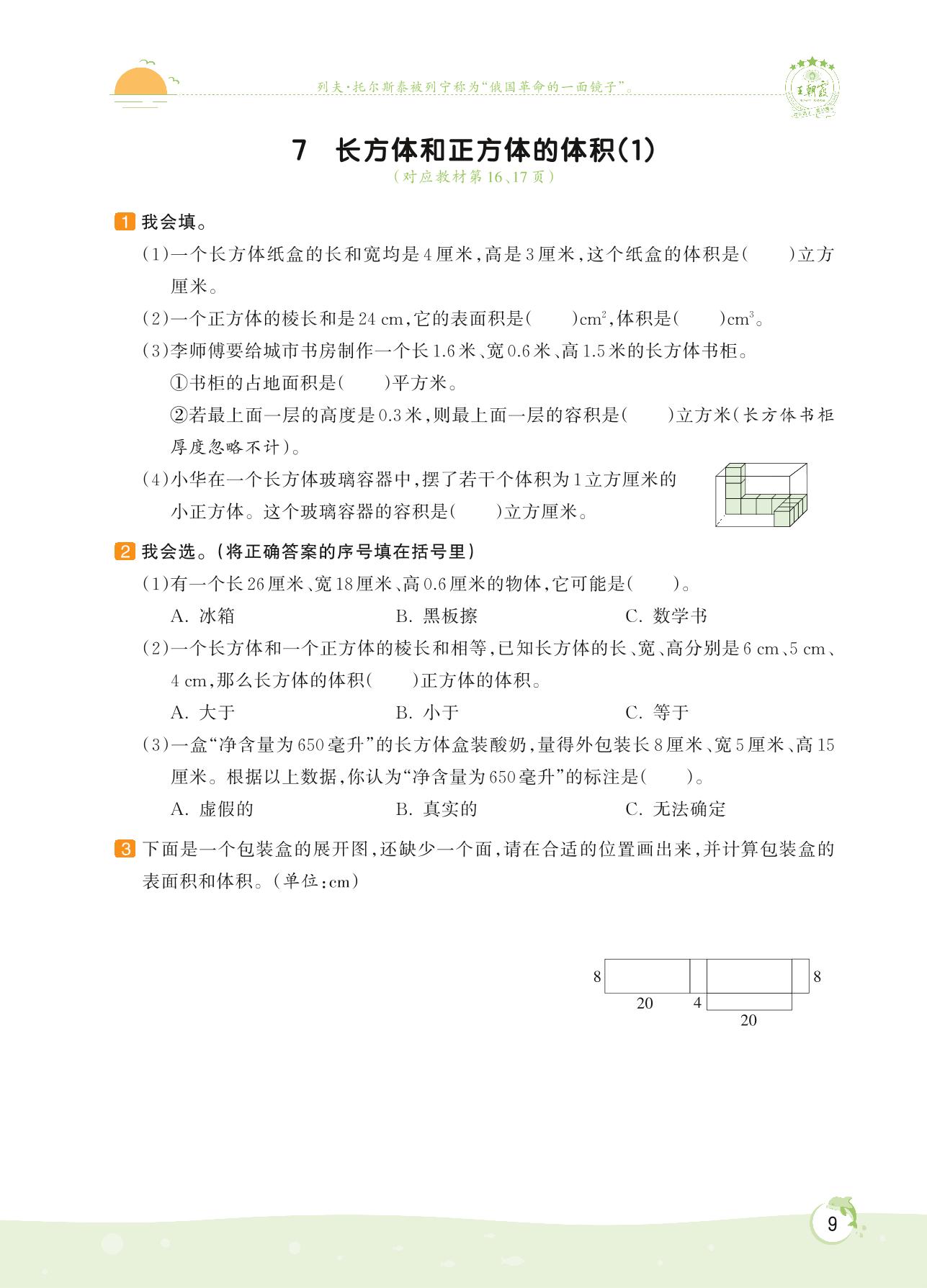 2022上册六年级数学苏教版 第一单元 长方体和正方体——7 长方体和正方体的体积(1)