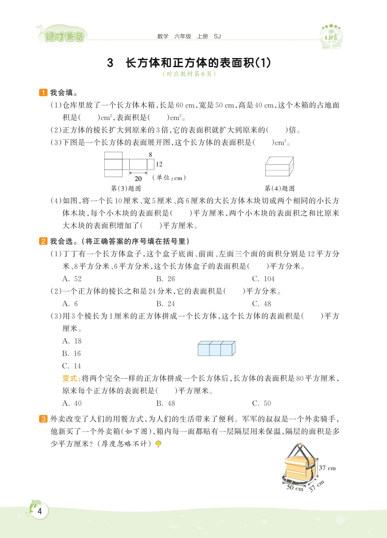 2022上册六年级数学苏教版 第一单元 长方体和正方体——3 长方体和正方体的表面积(1)