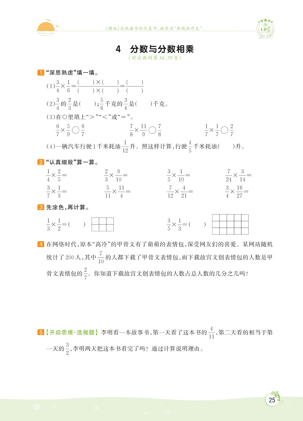2022上册六年级数学苏教版 第二单元 分数乘法——4 分数与分数相乘