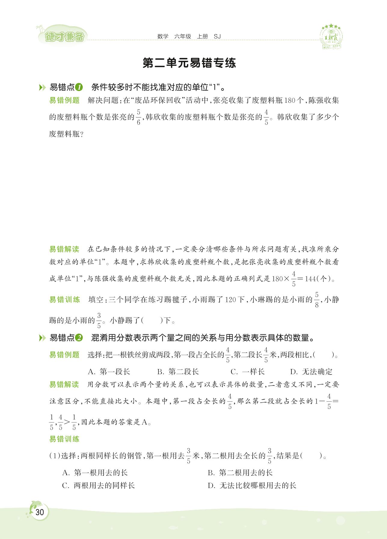 2022上册六年级数学苏教版 第二单元易错专练