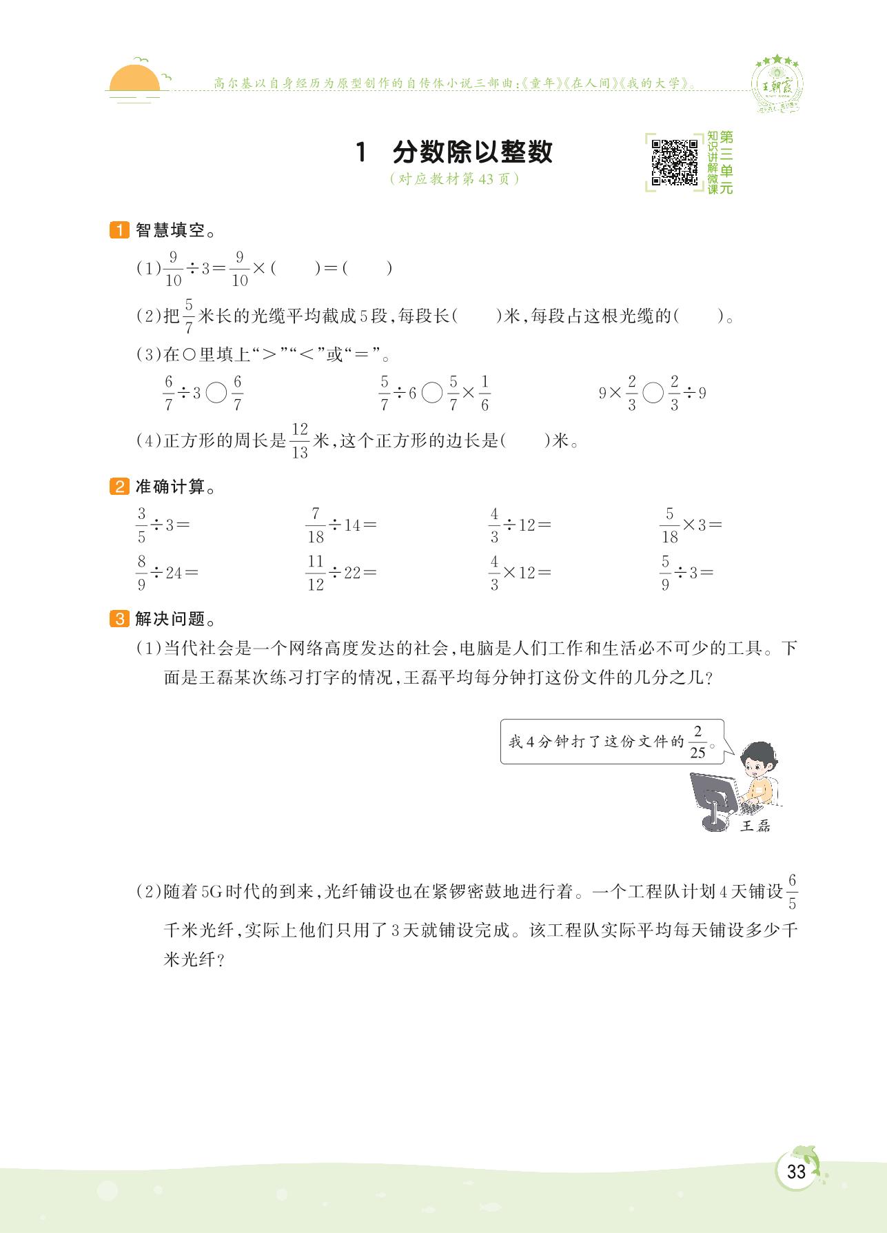 2022上册六年级数学苏教版 第三单元 分数除法——1 分数除以整数