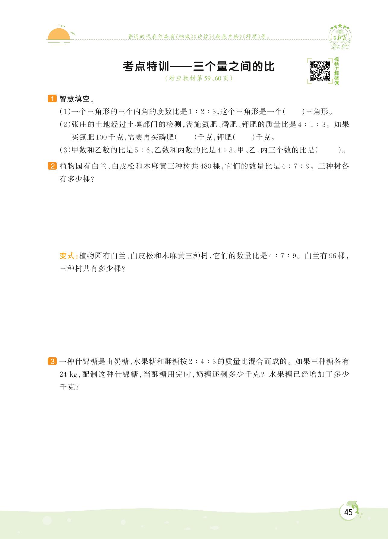 2022上册六年级数学苏教版 第三单元 分数除法——考点特训 三个量之间的比