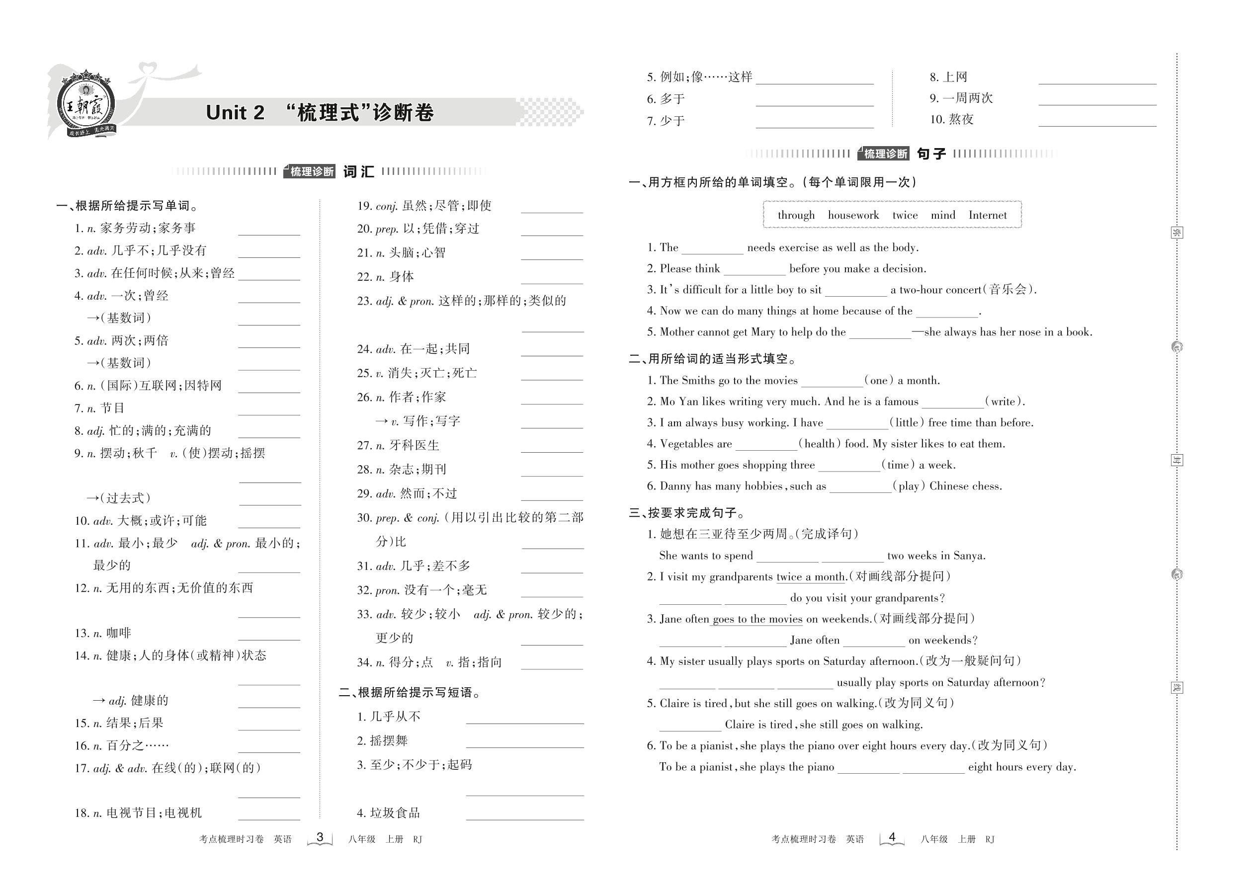 2022上册八年级英语人教版 Unit 2 “梳理式”诊断卷