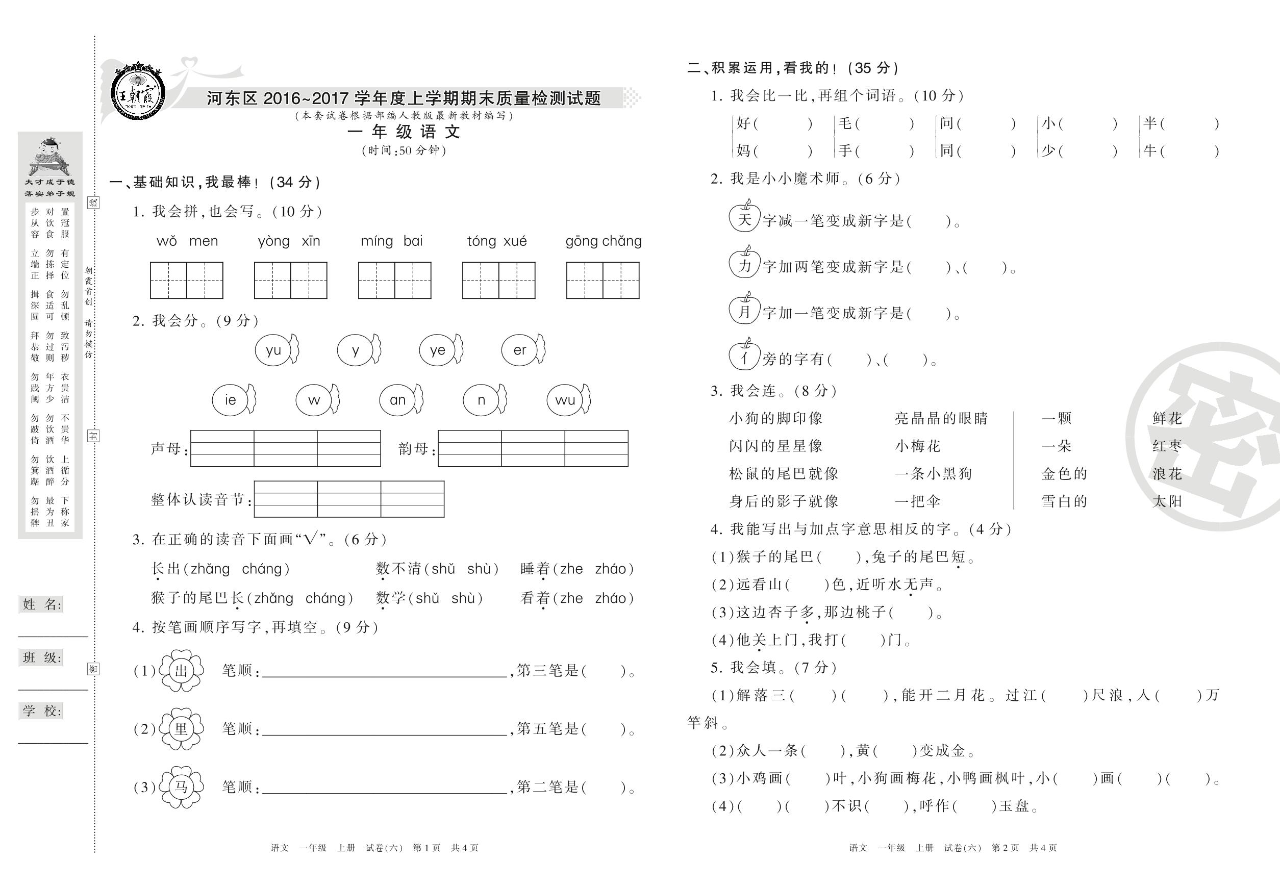 2016-2017学年第一学期临沂市河东区一年级语文试卷(人教版)【6】