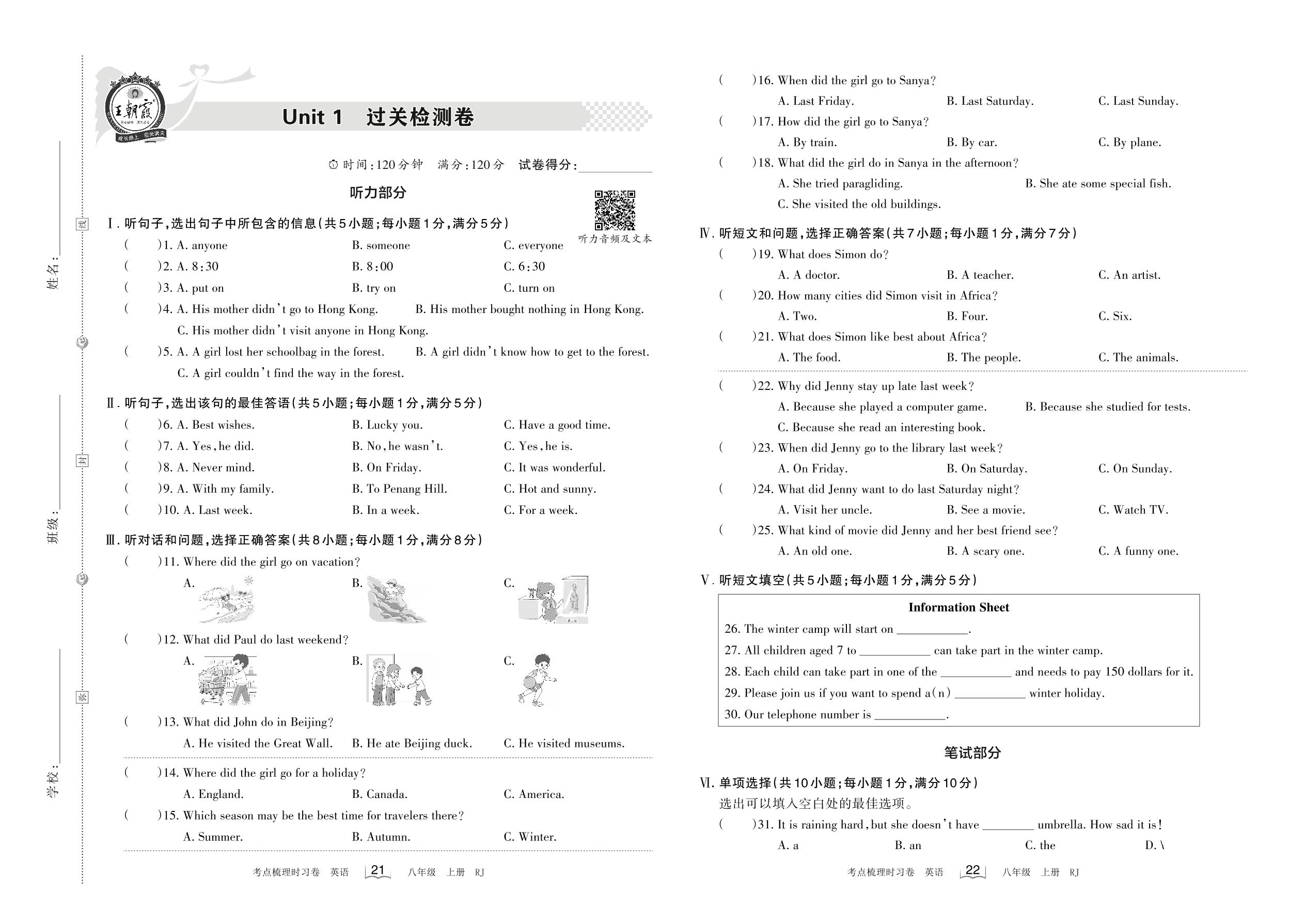 2022上册八年级英语人教版 Unit 1 过关检测卷