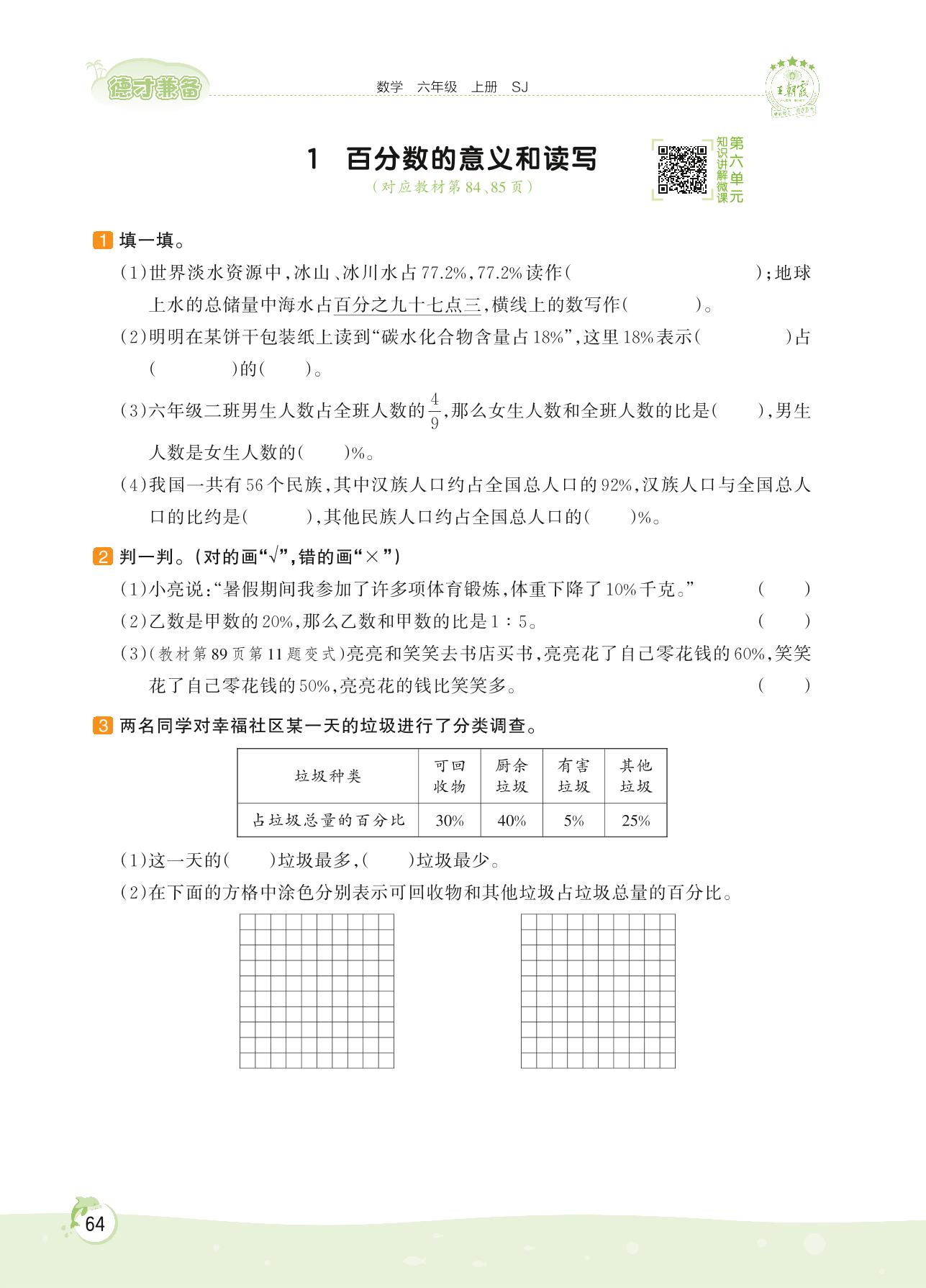 2022上册六年级数学苏教版 第六单元 百分数——1 百分数的意义和读写