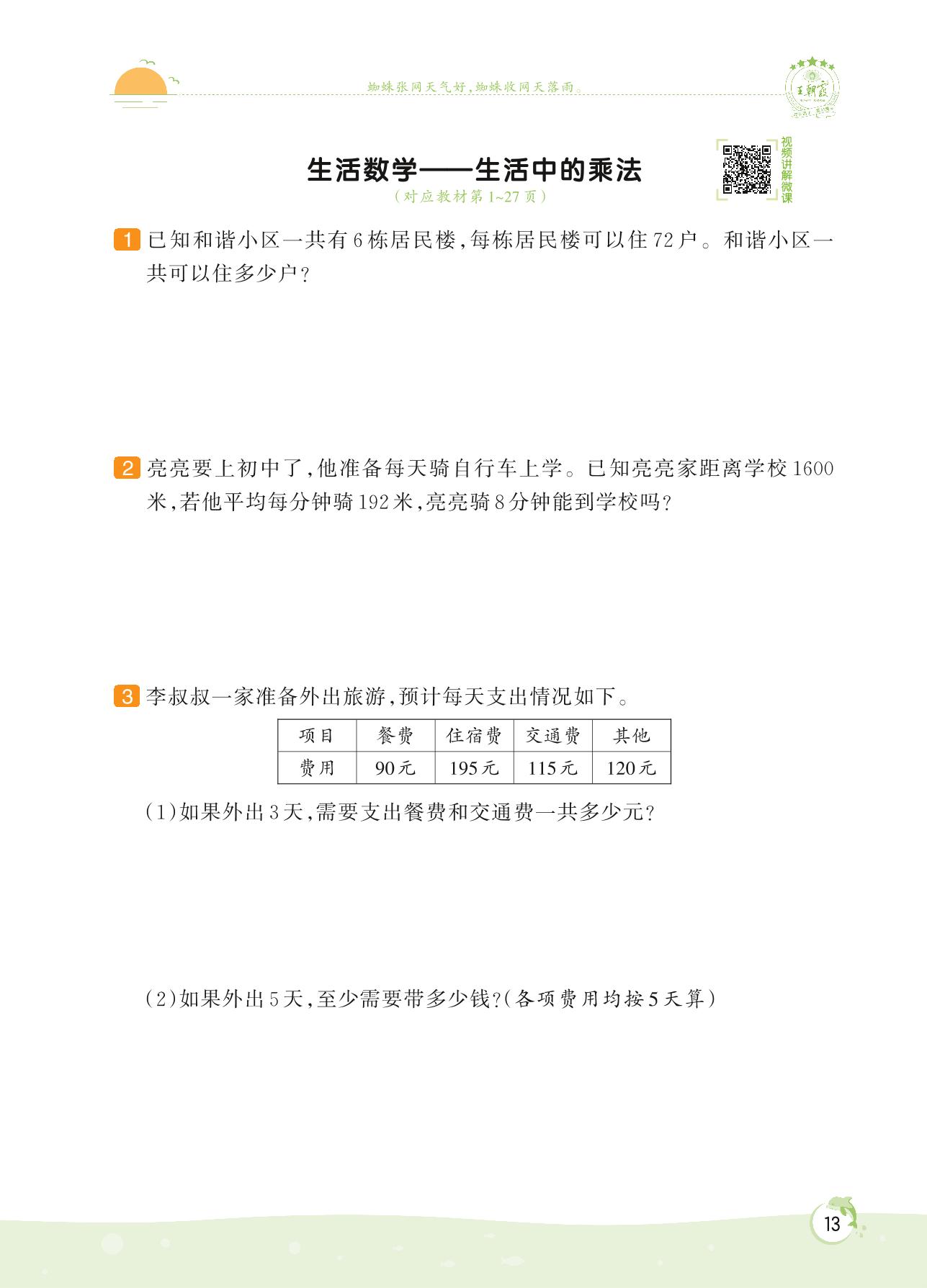 2022上册三年级数学苏教版 第一单元 两、三位数乘一位数——生活数学 生活中的乘法