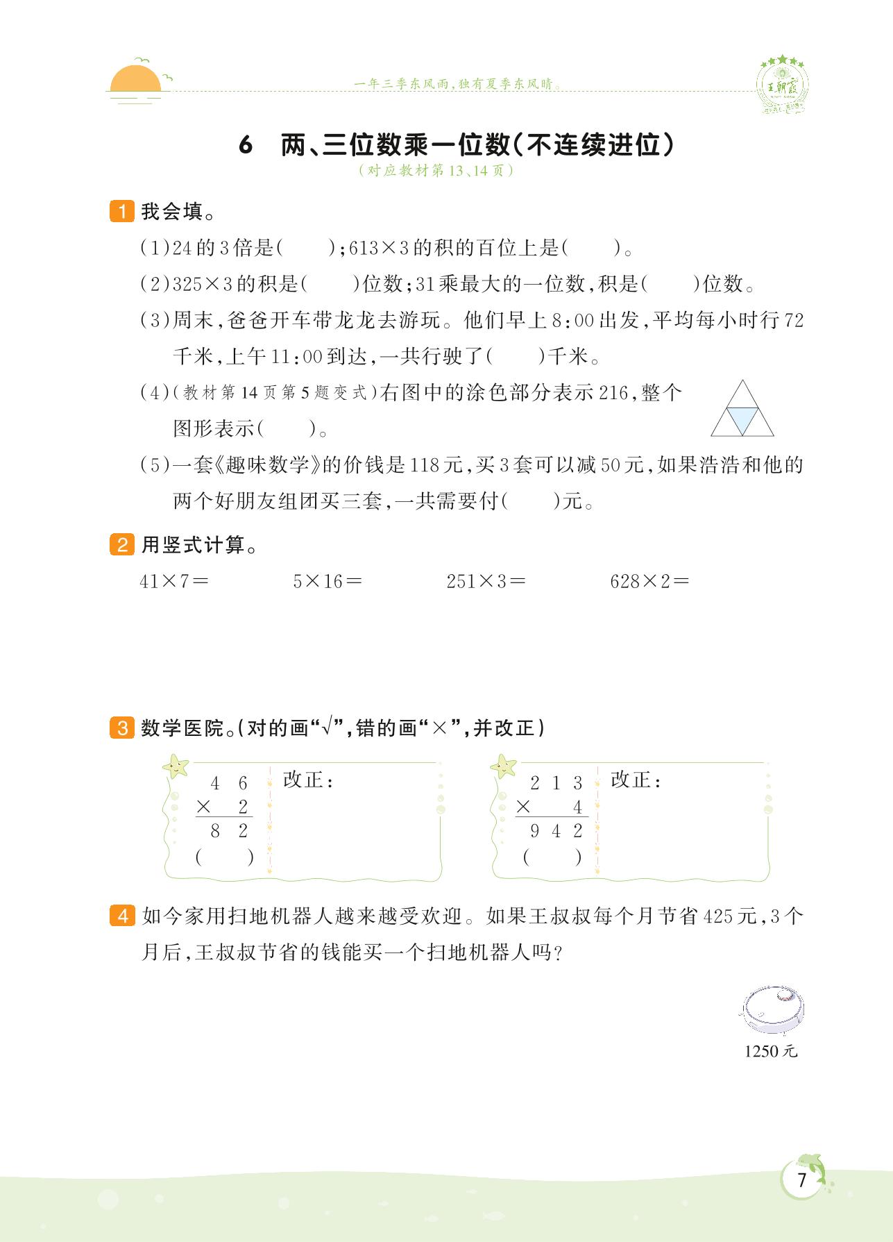 2022上册三年级数学苏教版 第一单元 两、三位数乘一位数——6 两、三位数乘一位数(不连续进位)
