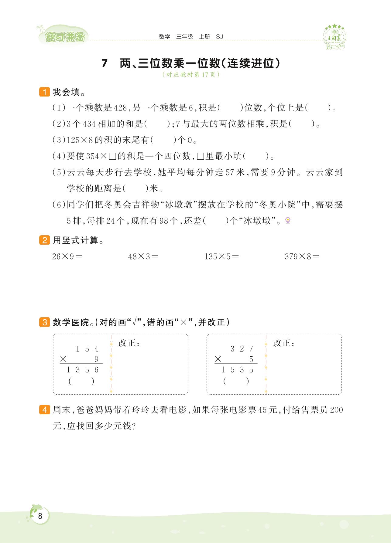 2022上册三年级数学苏教版 第一单元 两、三位数乘一位数——7 两、三位数乘一位数(连续进位)