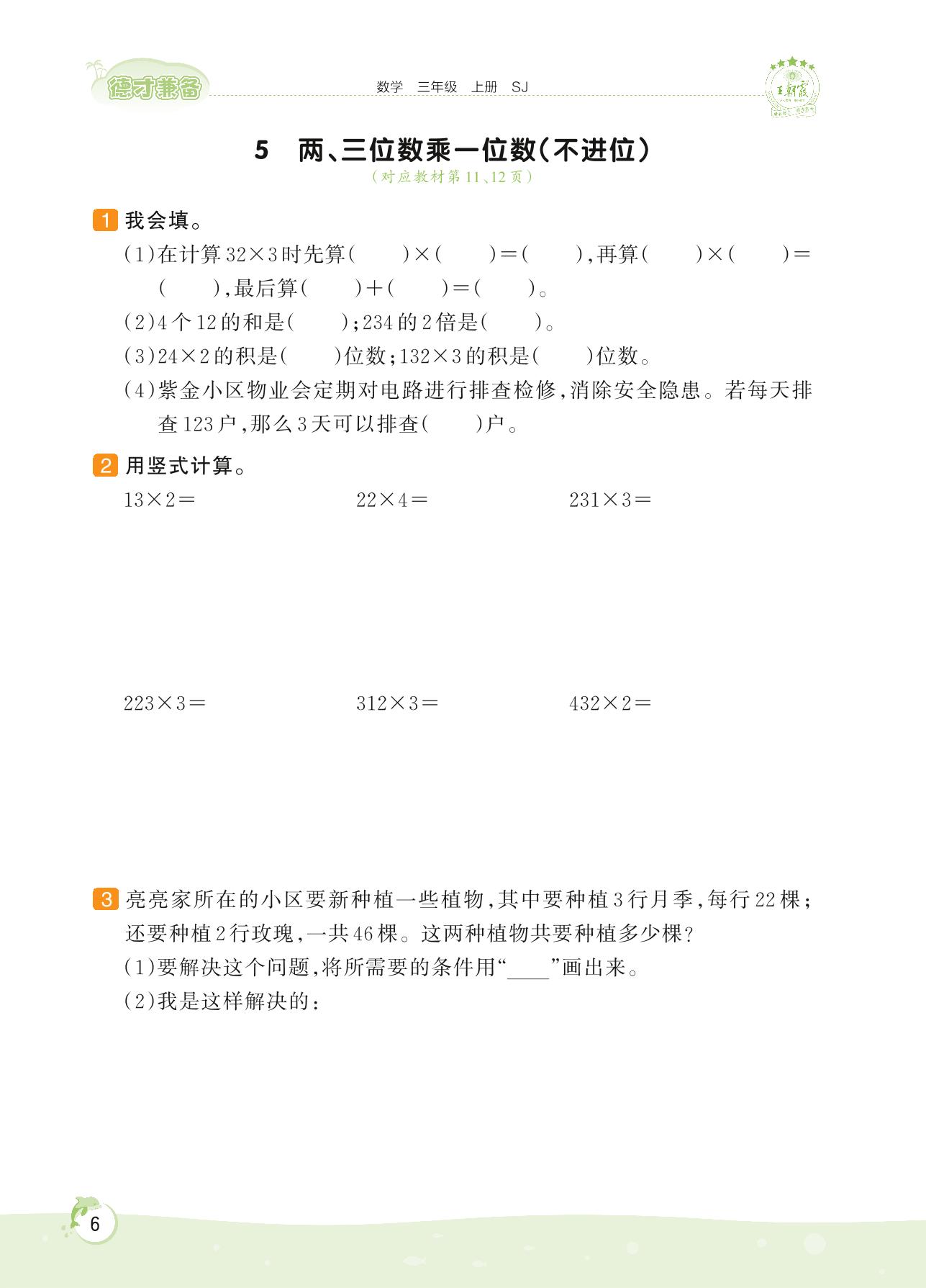 2022上册三年级数学苏教版 第一单元 两、三位数乘一位数——5 两、三位数乘一位数(不进位)