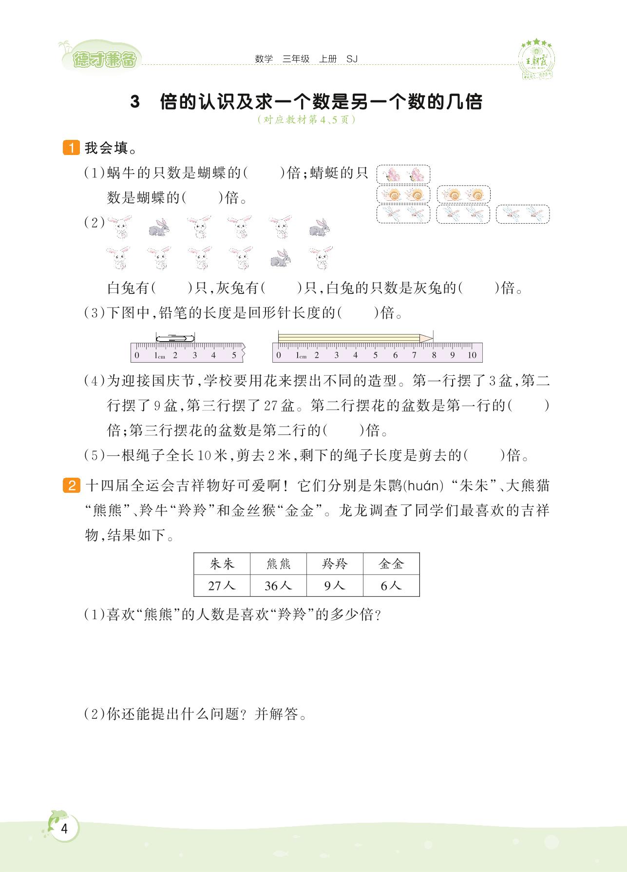 2022上册三年级数学苏教版 第一单元 两、三位数乘一位数——3 倍的认识及求一个数是另一个数的几倍