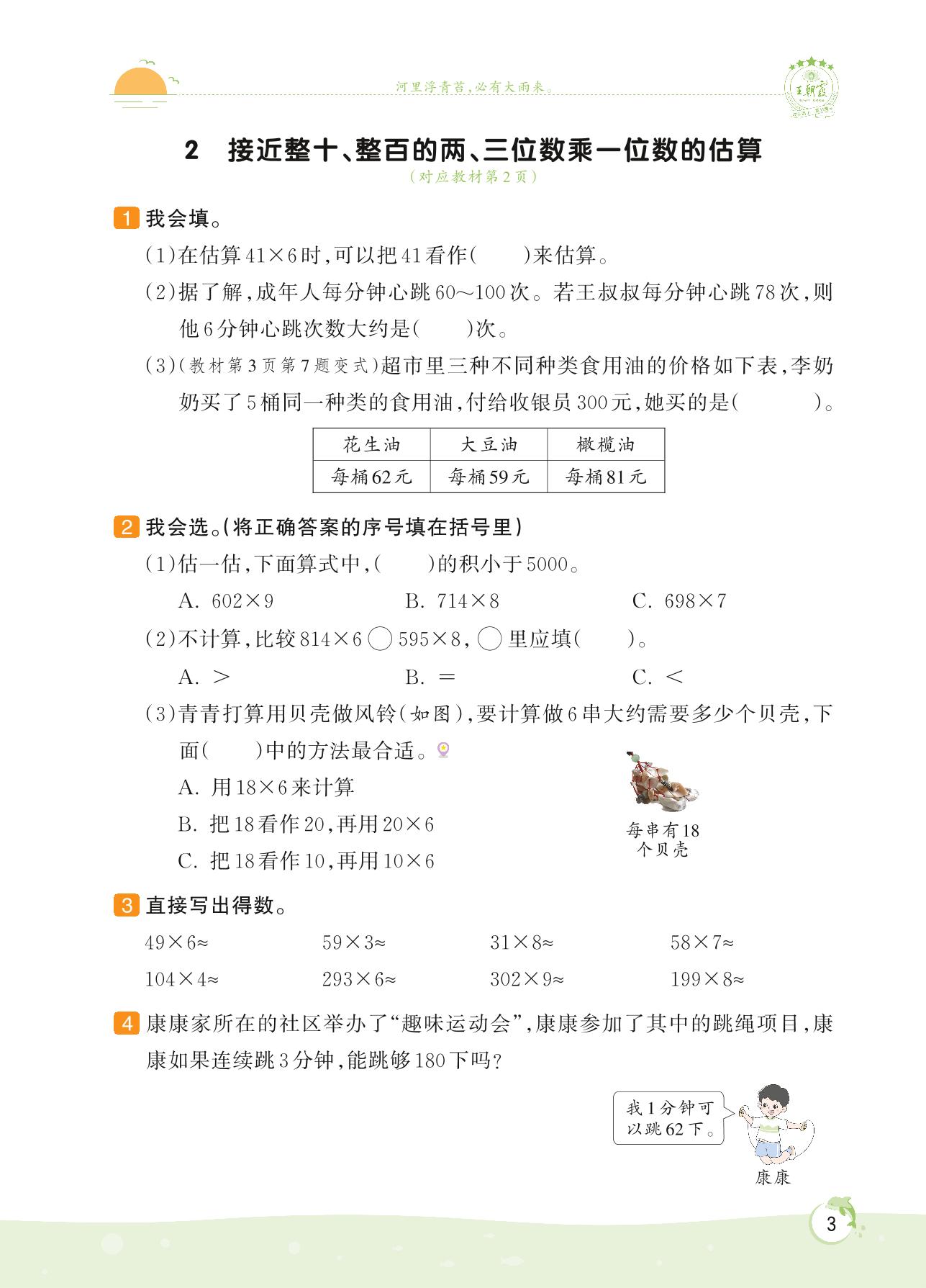 2022上册三年级数学苏教版 第一单元 两、三位数乘一位数——2 接近整十、整百的两、三位数乘一位数的估算