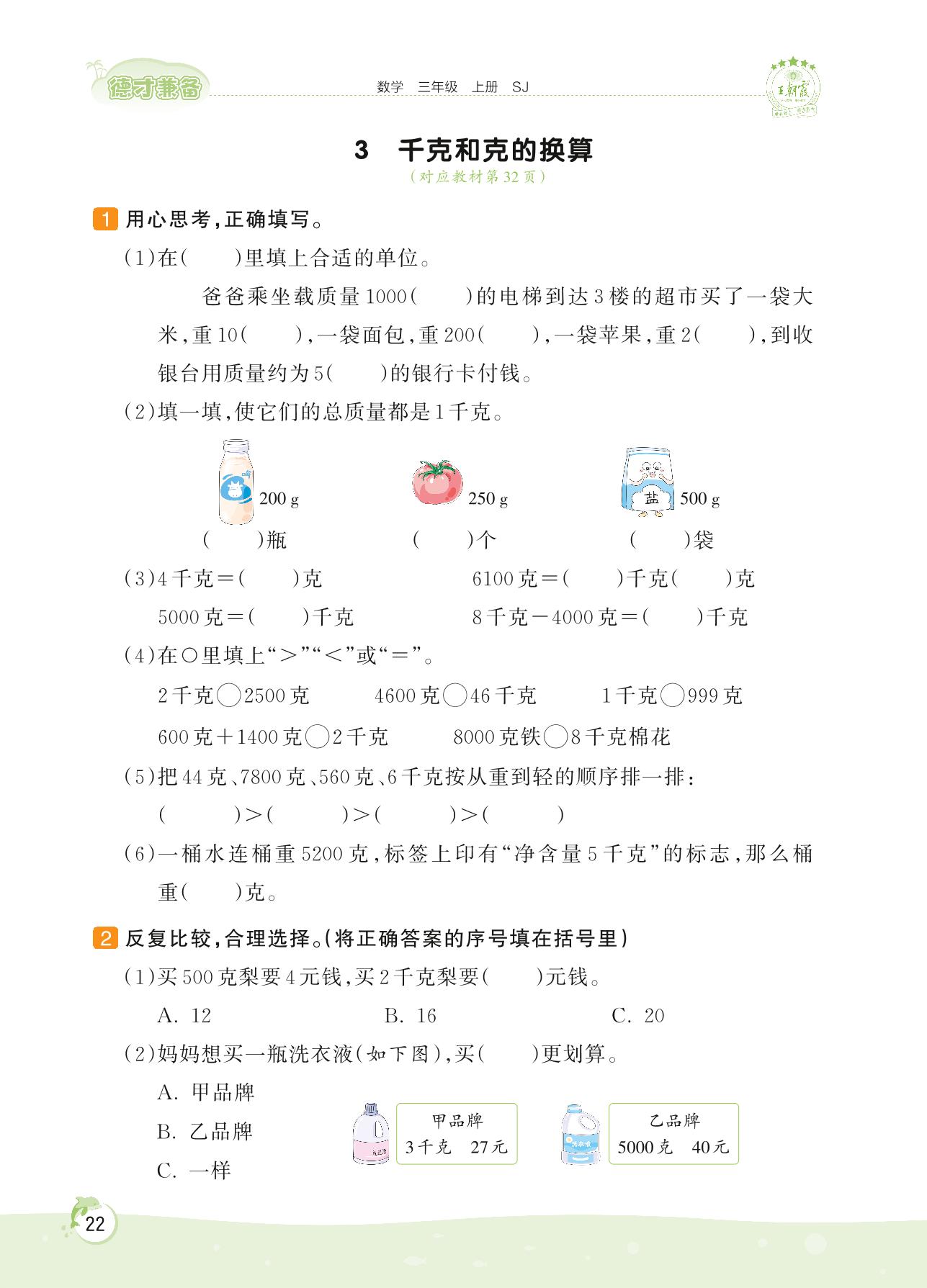 2022上册三年级数学苏教版 第二单元 千克和克——3 千克和克的换算