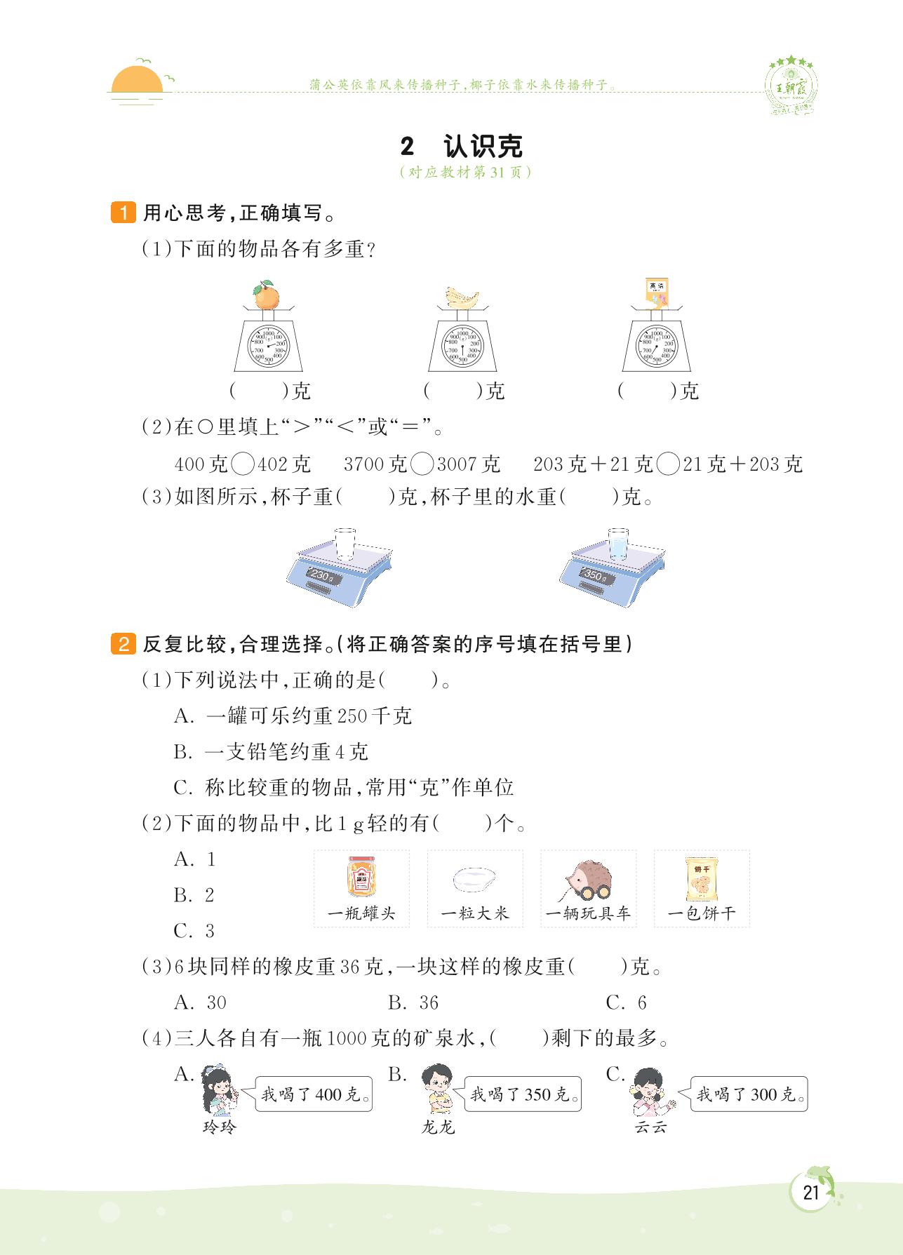 2022上册三年级数学苏教版 第二单元 千克和克——2 认识克