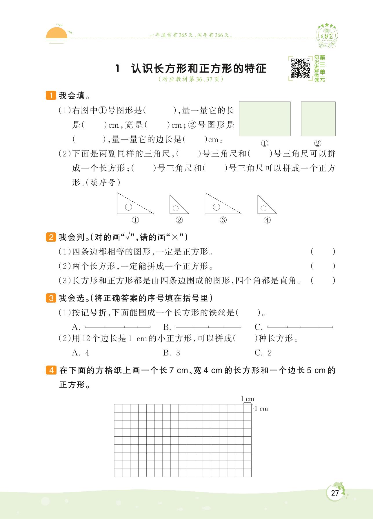 2022上册三年级数学苏教版 第三单元 长方形和正方形——1 认识长方形和正方形的特征