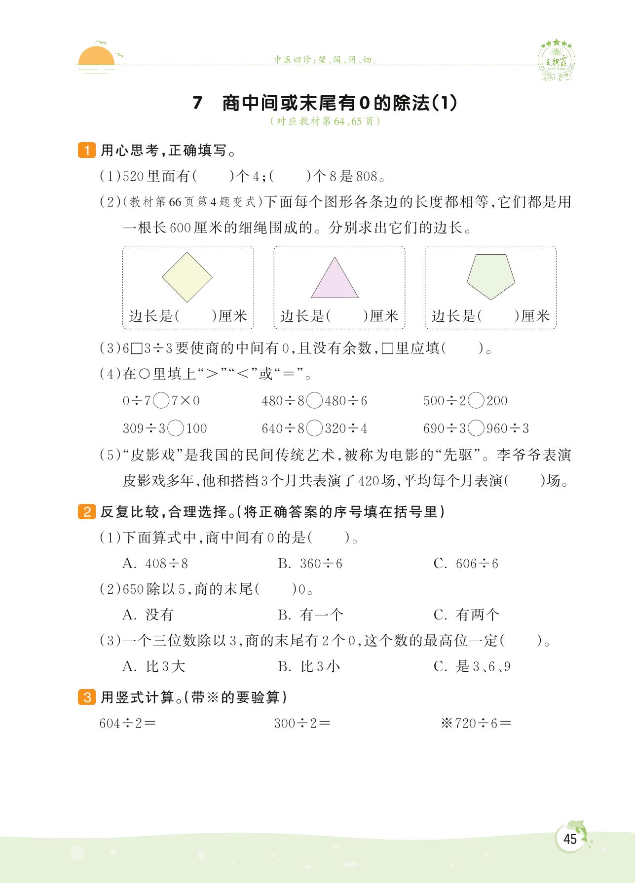 2022上册三年级数学苏教版 第四单元 两、三位数除以一位数——7 商中间或末尾有0的除法(1)