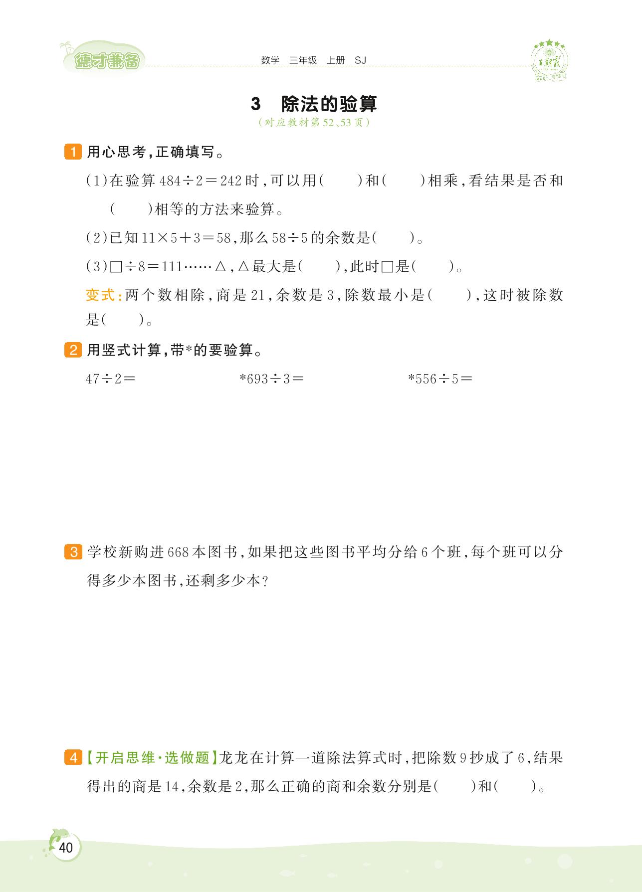 2022上册三年级数学苏教版 第四单元 两、三位数除以一位数——3 除法的验算
