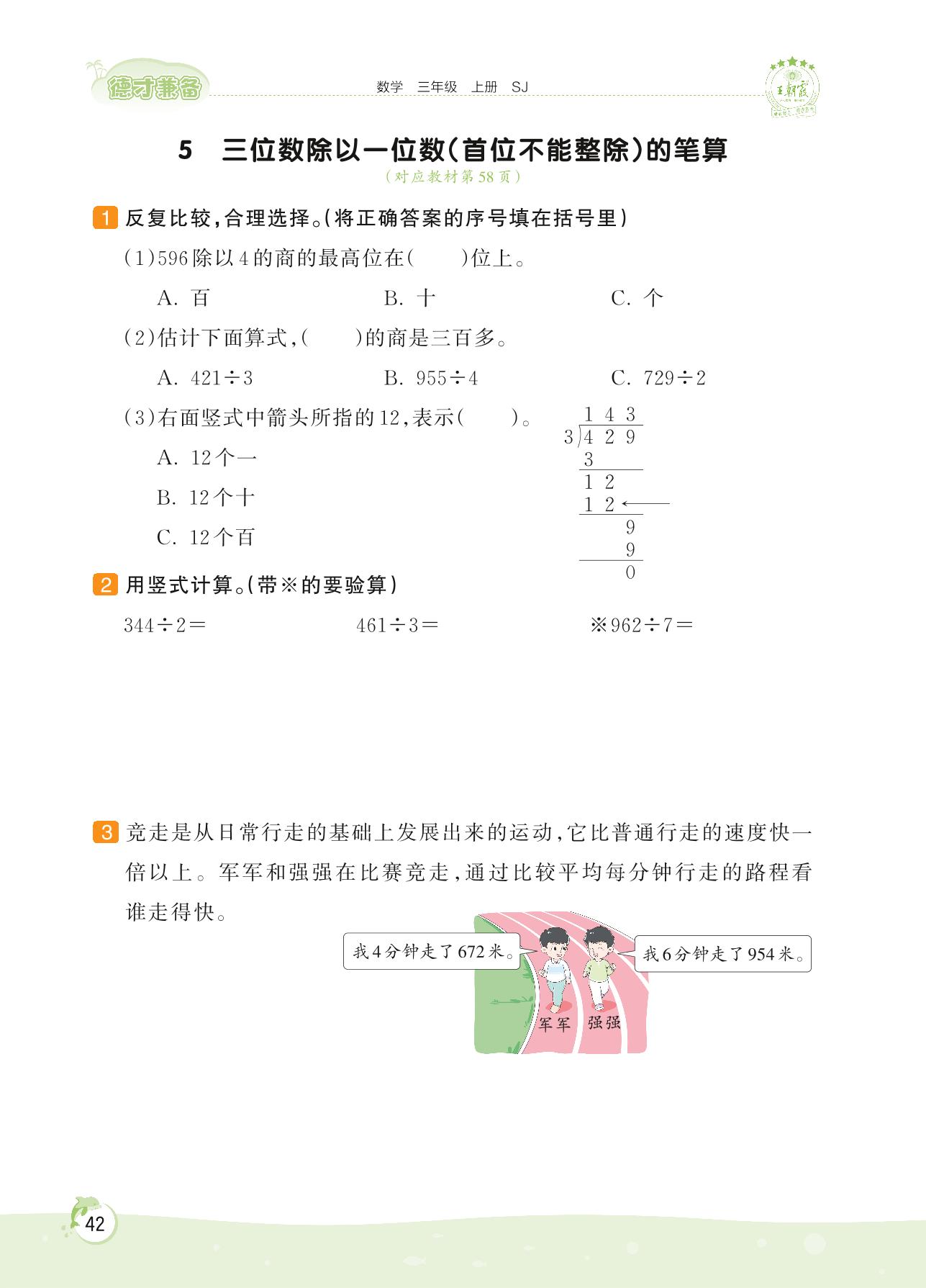 2022上册三年级数学苏教版 第四单元 两、三位数除以一位数——5 三位数除以一位数(首位不能整除)的笔算
