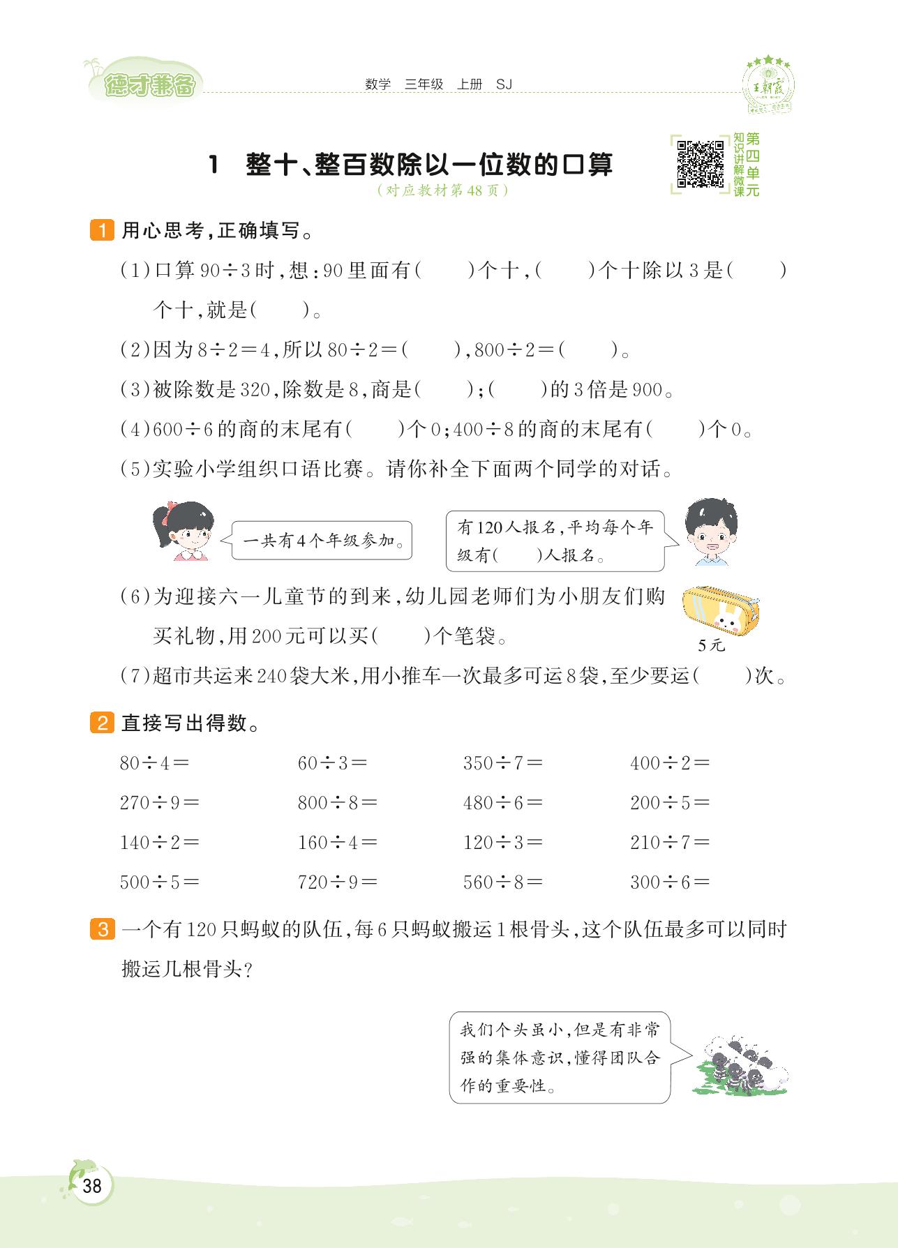 2022上册三年级数学苏教版 第四单元 两、三位数除以一位数——1 整十、整百数除以一位数的口算