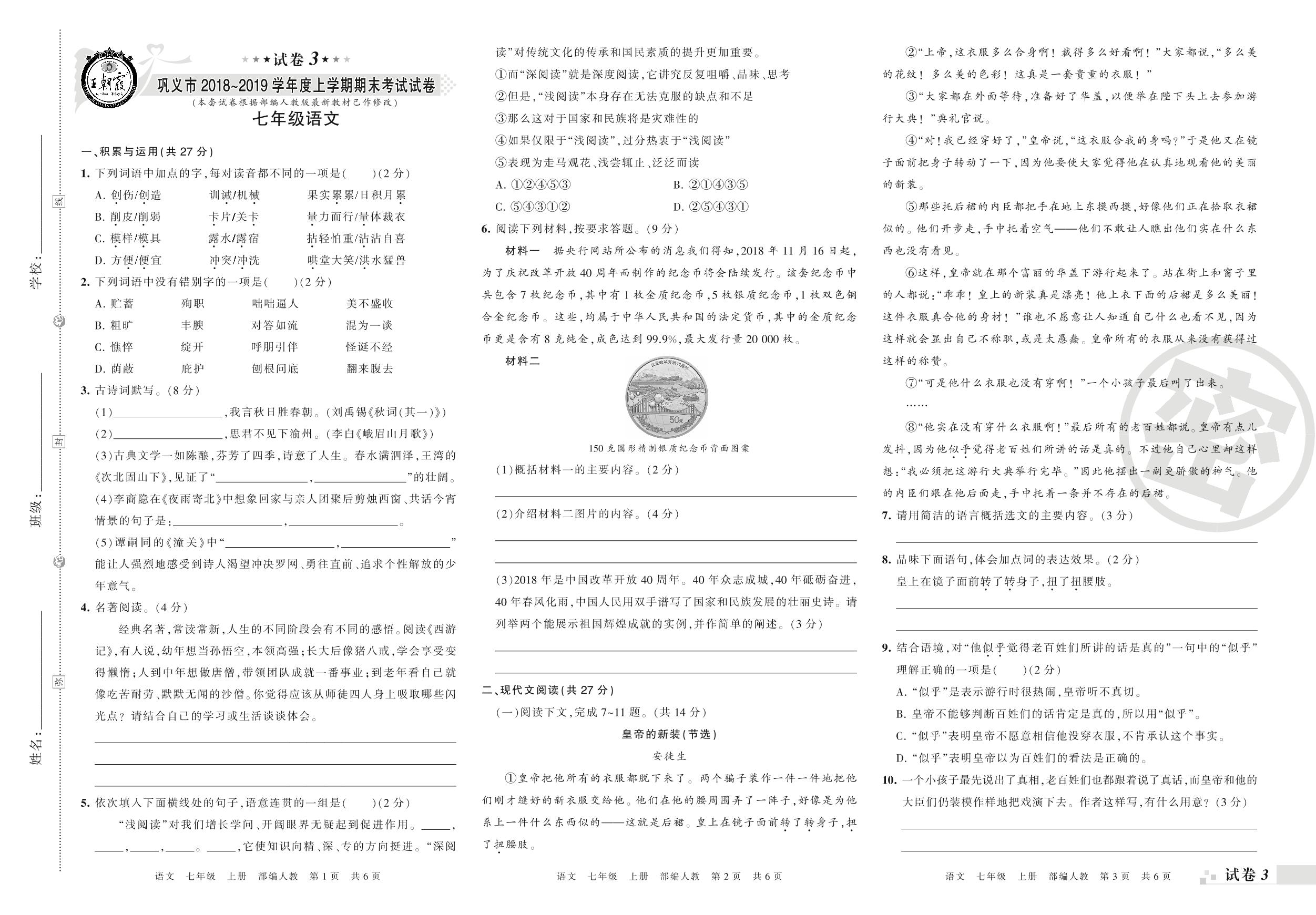 2018-2019学年第一学期巩义市七年级语文试卷(人教版)【3】