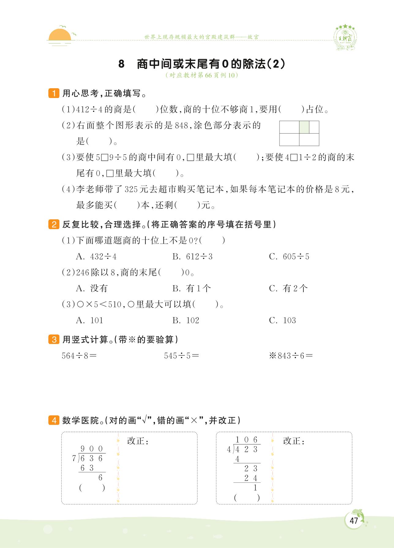 2022上册三年级数学苏教版 第四单元 两、三位数除以一位数——8 商中间或末尾有0的除法(2)