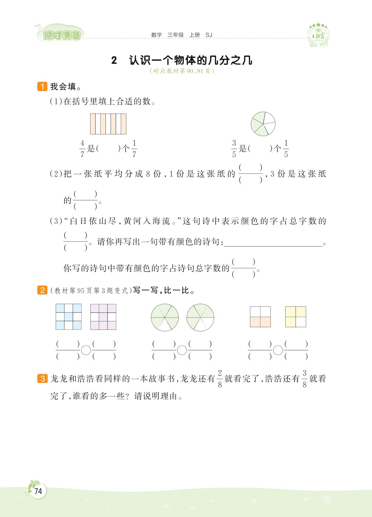 2022上册三年级数学苏教版 第七单元 分数的初步认识(一)——2 认识一个物体的几分之几