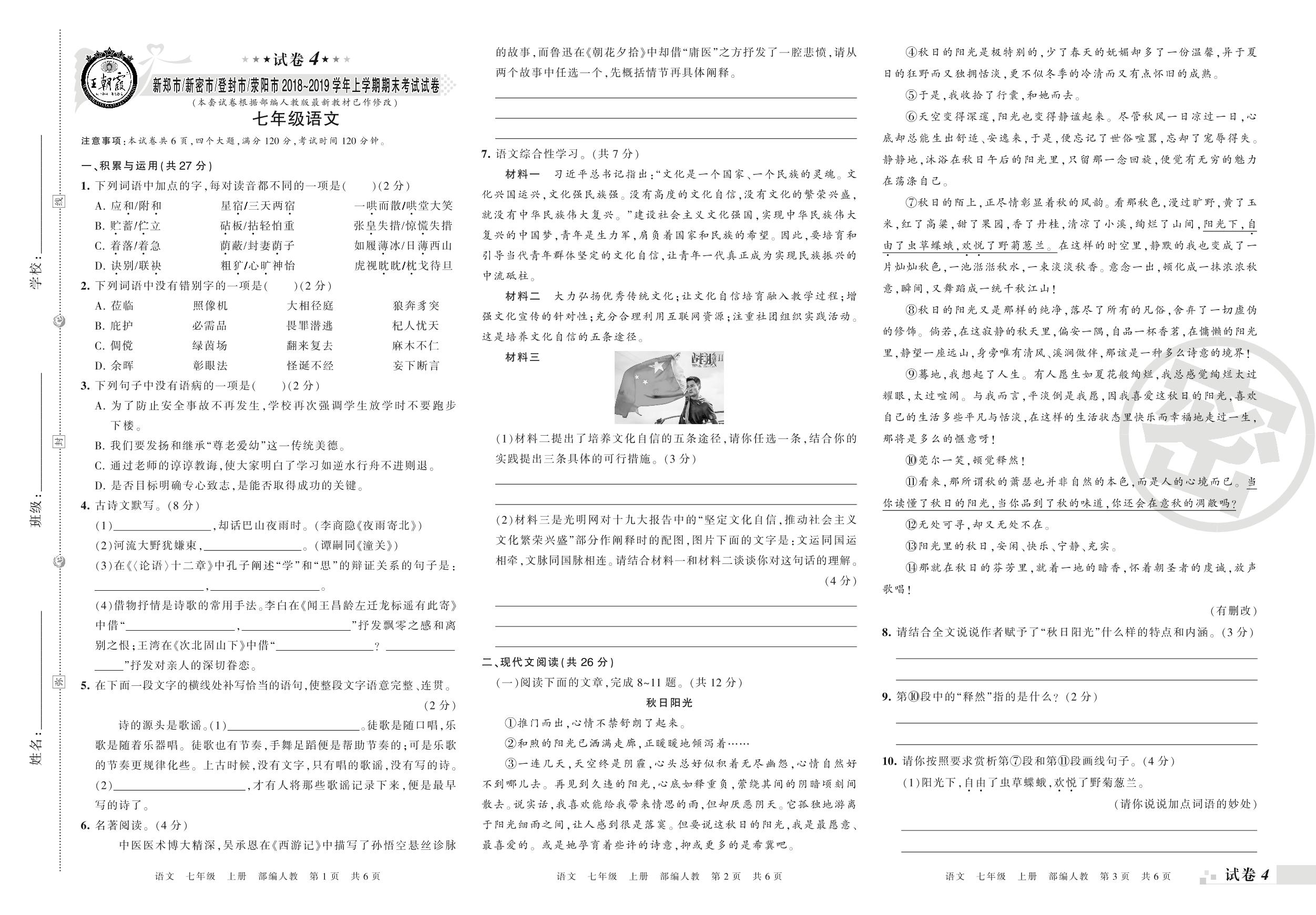 2018-2019学年第一学期新郑市、新密市、登封市、荥阳市七年级语文试卷(人教版)【4】