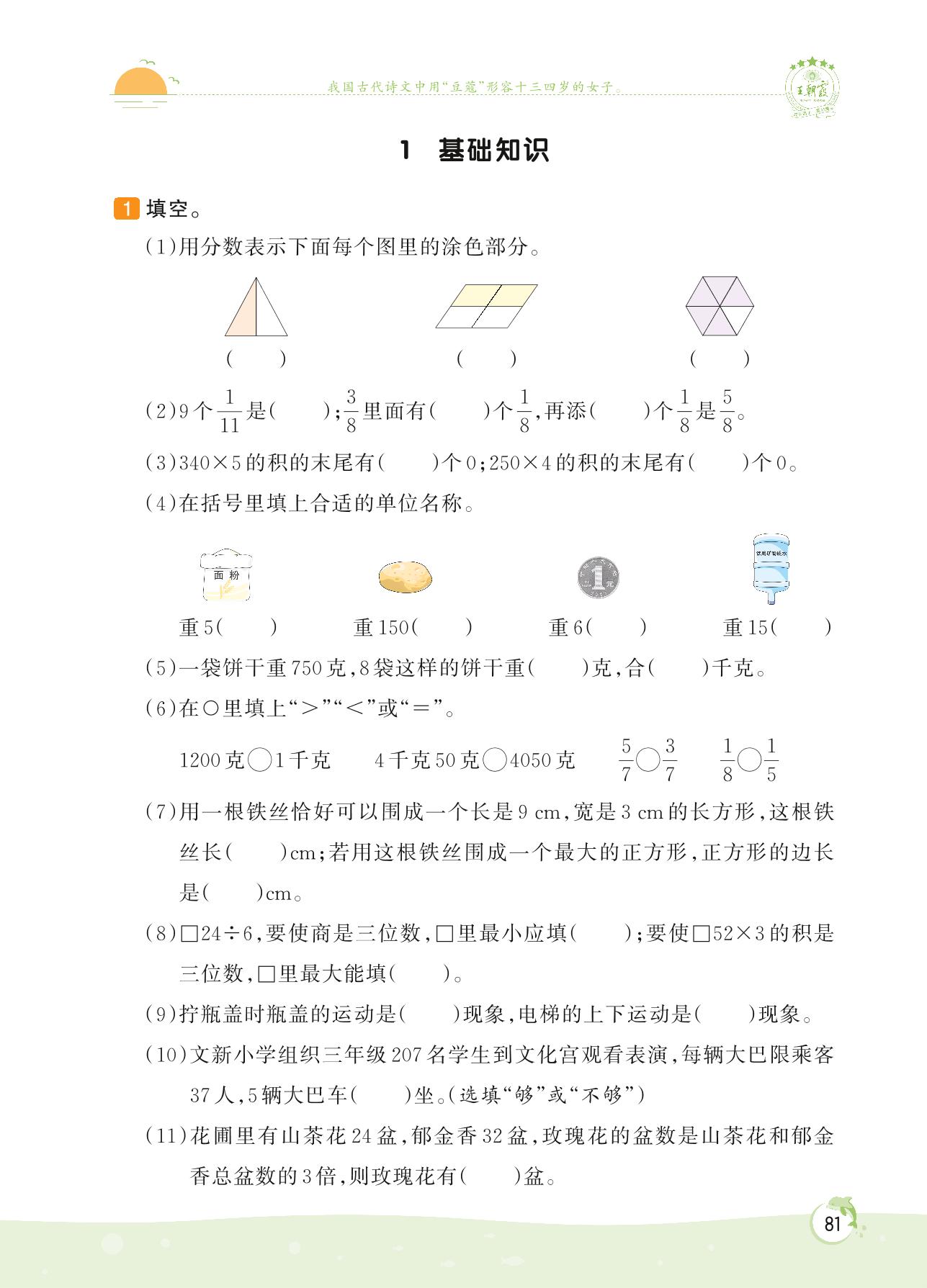2022上册三年级数学苏教版 第八单元 期末复习——1 基础知识