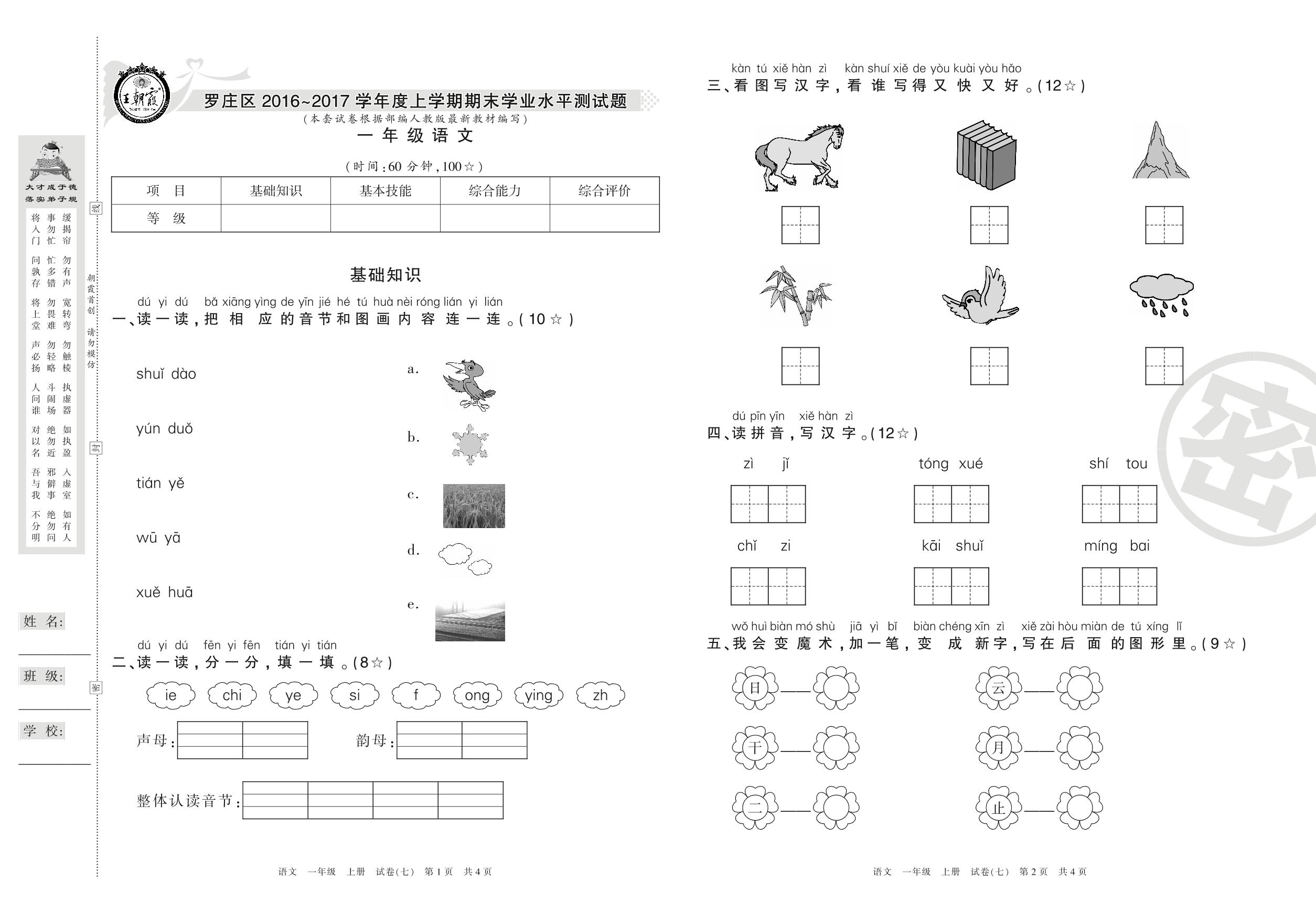 2016-2017学年第一学期临沂市罗庄区一年级语文试卷(人教版)【7】
