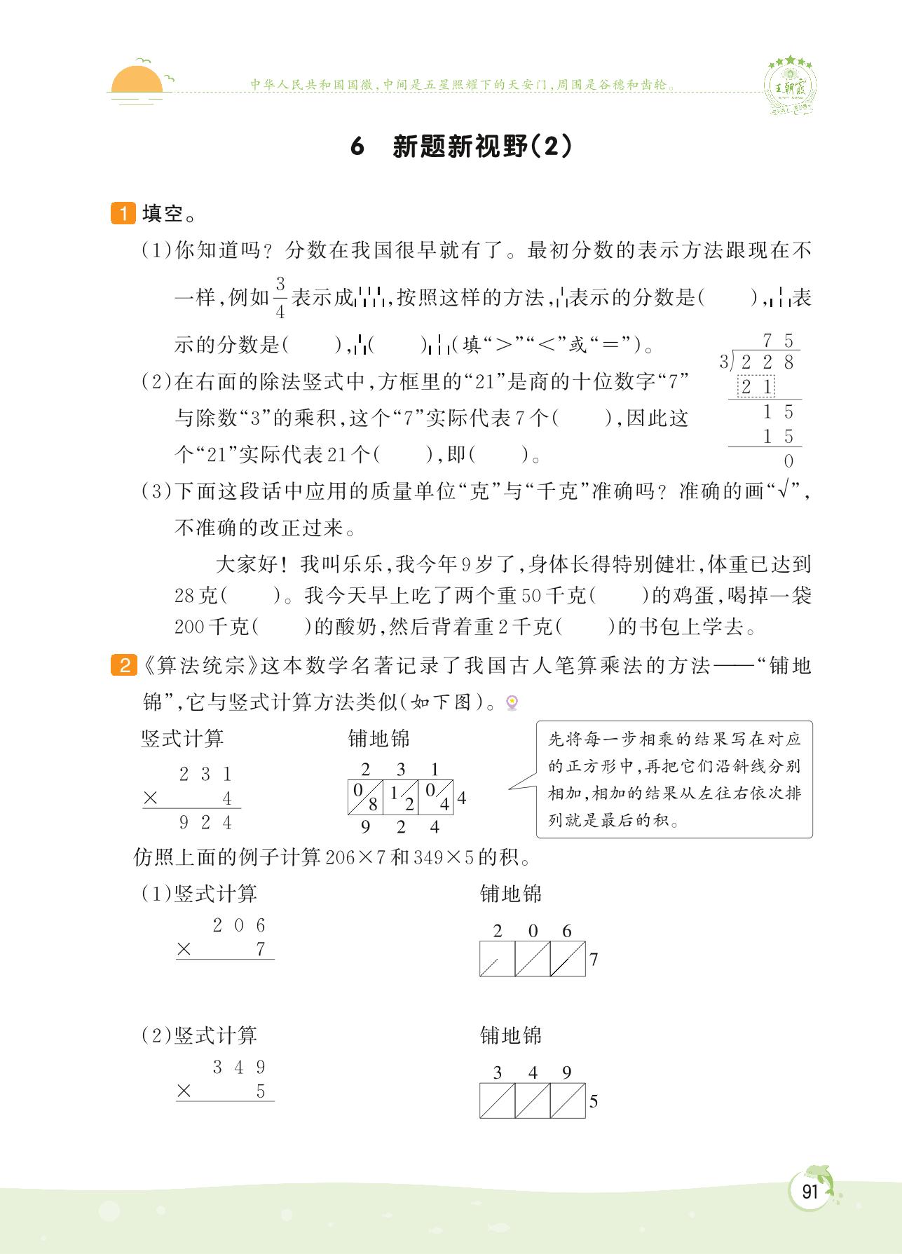 2022上册三年级数学苏教版 第八单元 期末复习——6 新题新视野(2)