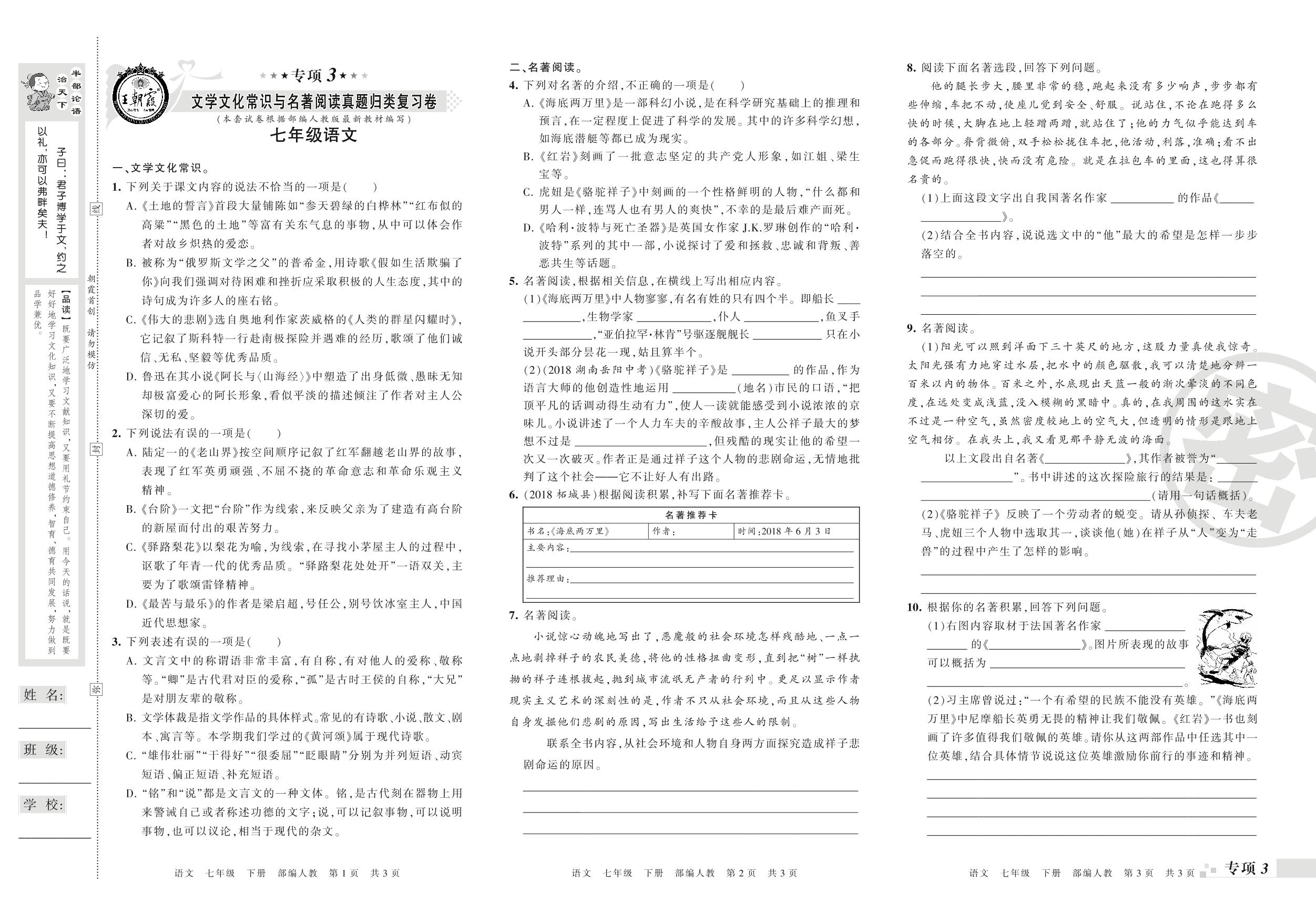 王朝霞期末专项卷——文学文化常识与名著阅读、综合性学习真题归类复习卷七年级下册语文(人教版)_R21080241418【0】